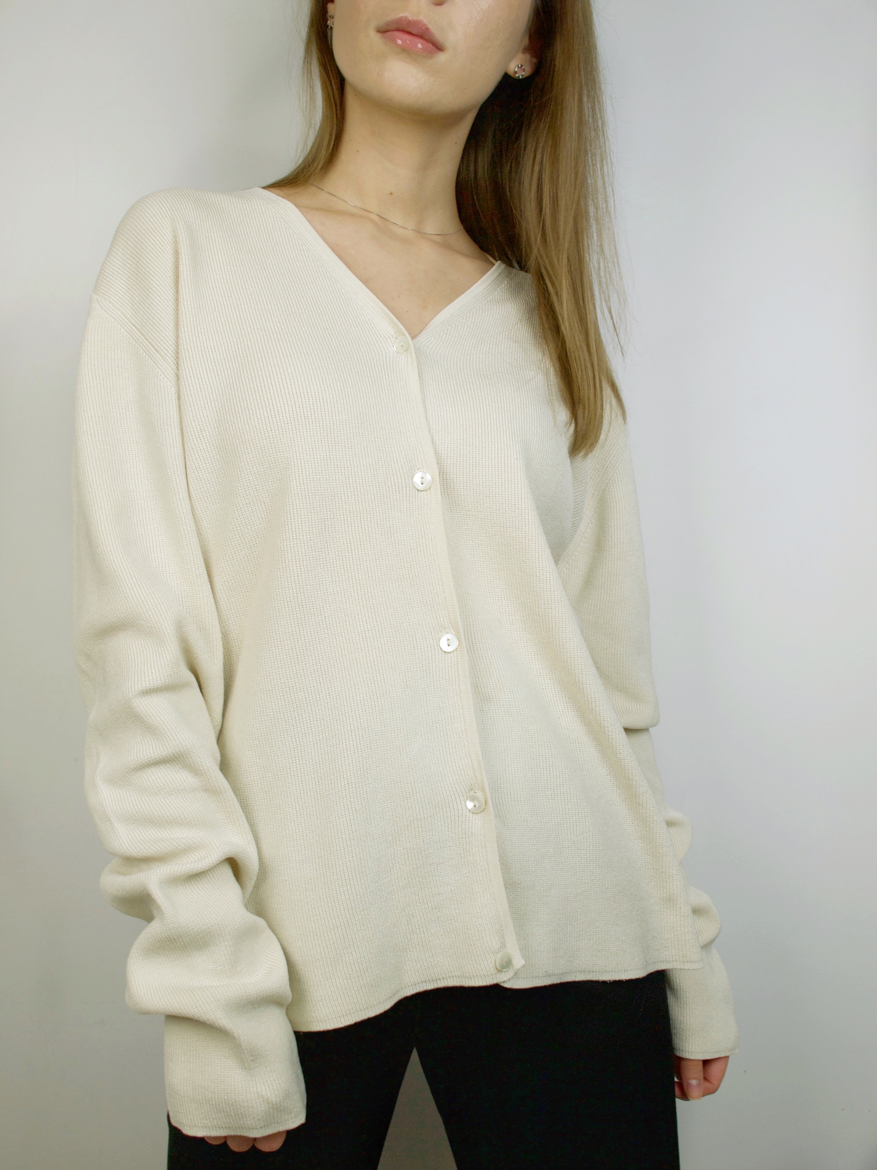 70,00 zł55,00 złJedwabny kardigan vintage. Zapinany na guziki z naturalnej muszli. Ma małe plamki, pokazane na zdjęciu, poza tym bez wad. Rozmiar z metki L, dobry także jako oversize.