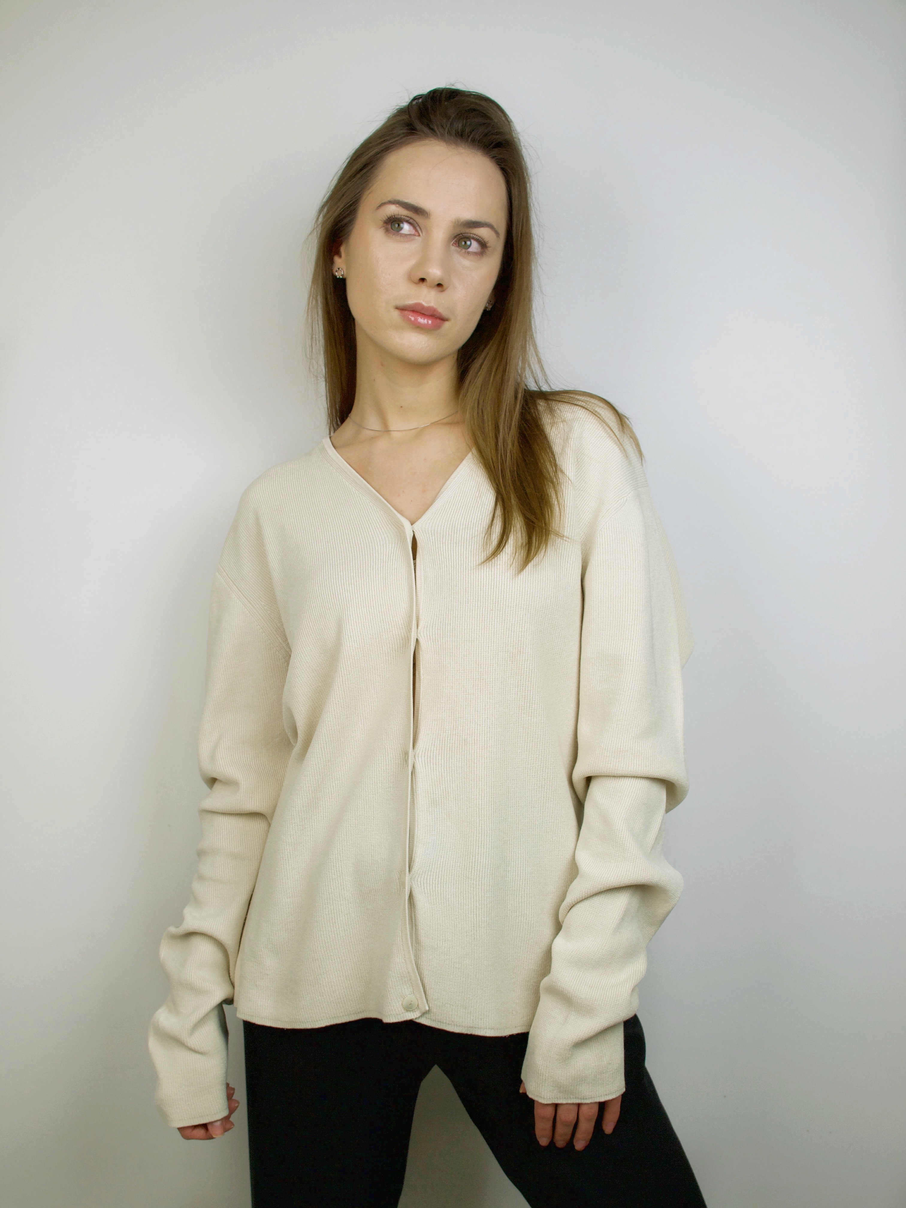 70,00 zł55,00 złJedwabny kardigan vintage. Zapinany na guziki z naturalnej muszli. Ma małe plamki, pokazane na zdjęciu, poza tym bez wad. Rozmiar z metki L, dobry także jako oversize.