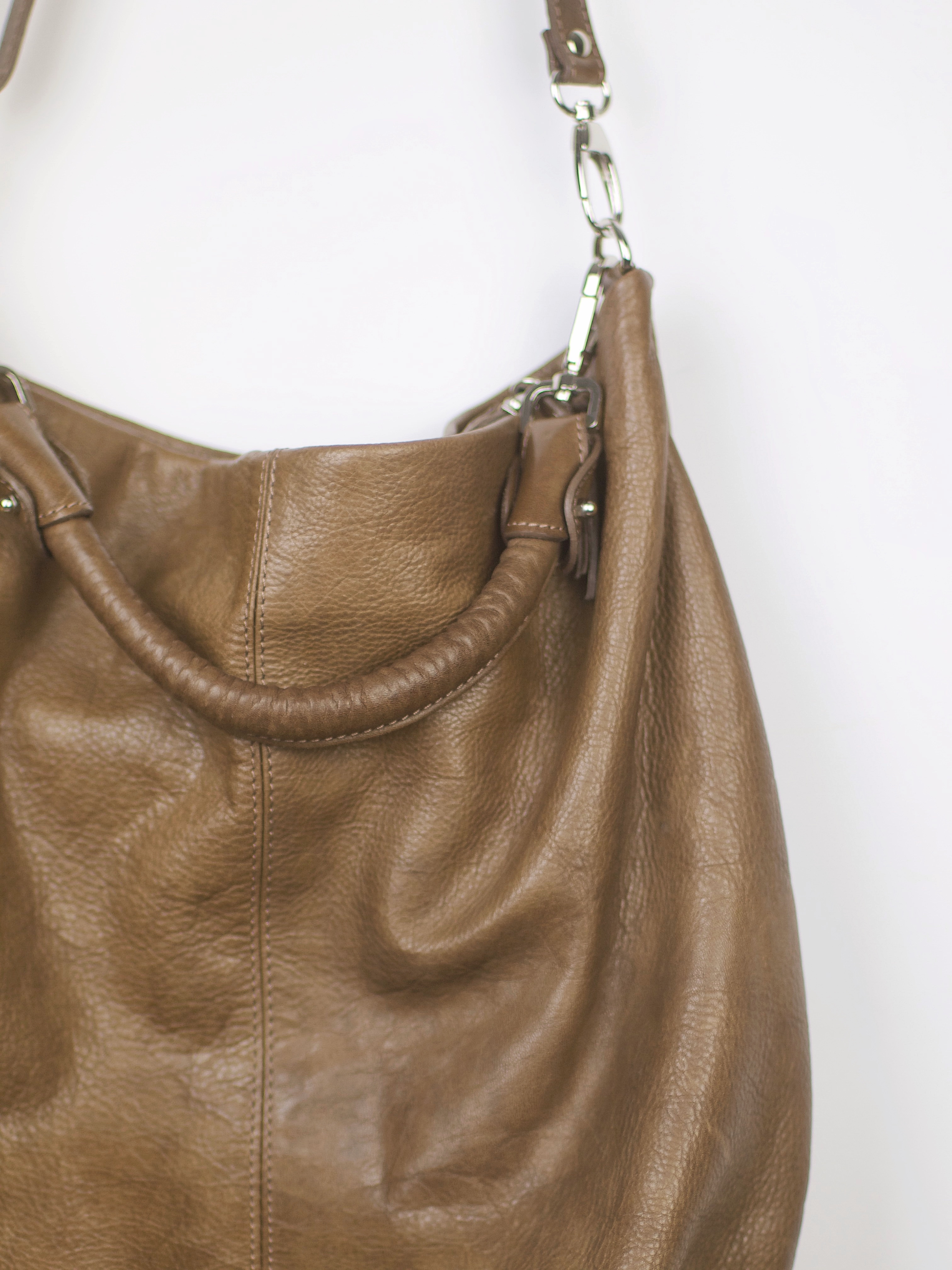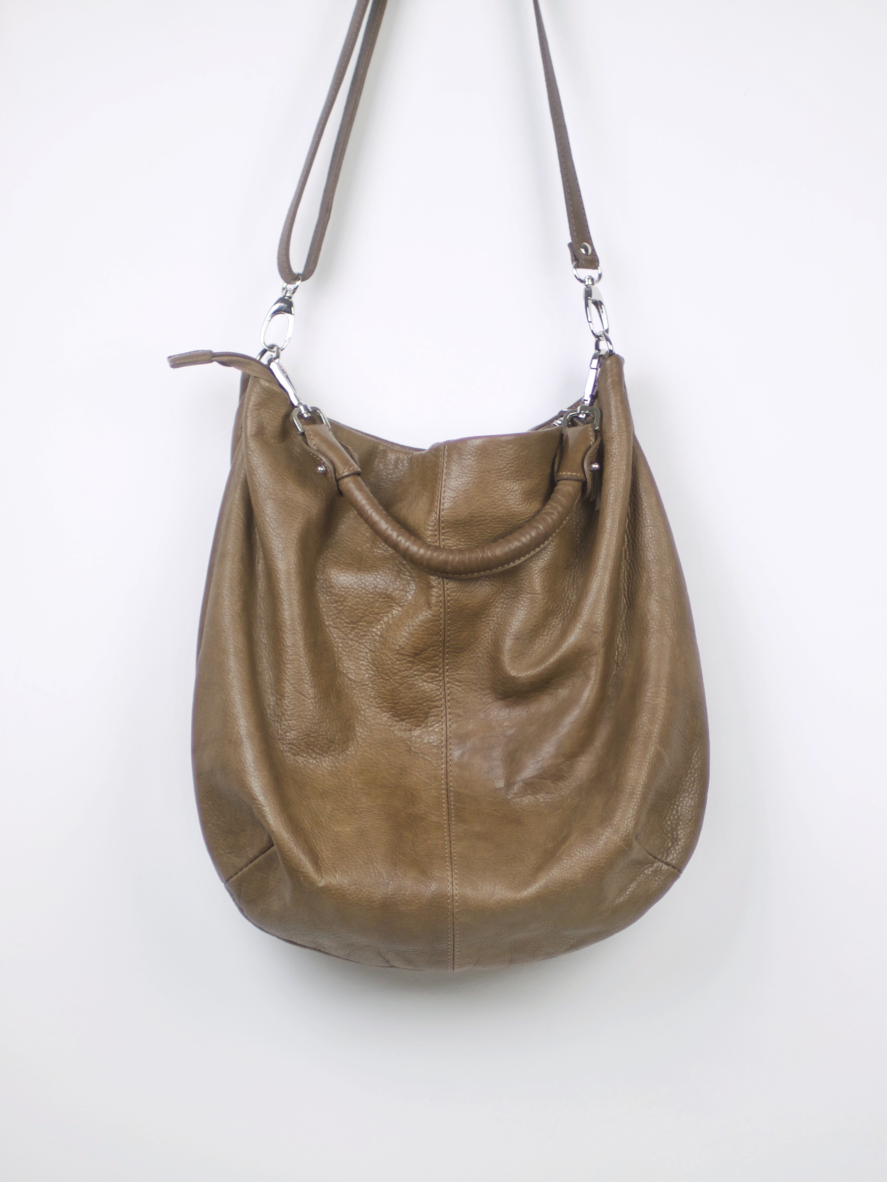 Pojemna torebka vintage, wykonana z mięciutkiej skóry naturalnej. Dwa odpinane paski, w środku jedna duża komora, kieszonka zapinana na zamek, oraz kieszonki na telefon. Bardzo dobry stan. Wymiary: wysokość 42 cm, szerokość 41 cm, długość pasków 18 oraz 47 cm.