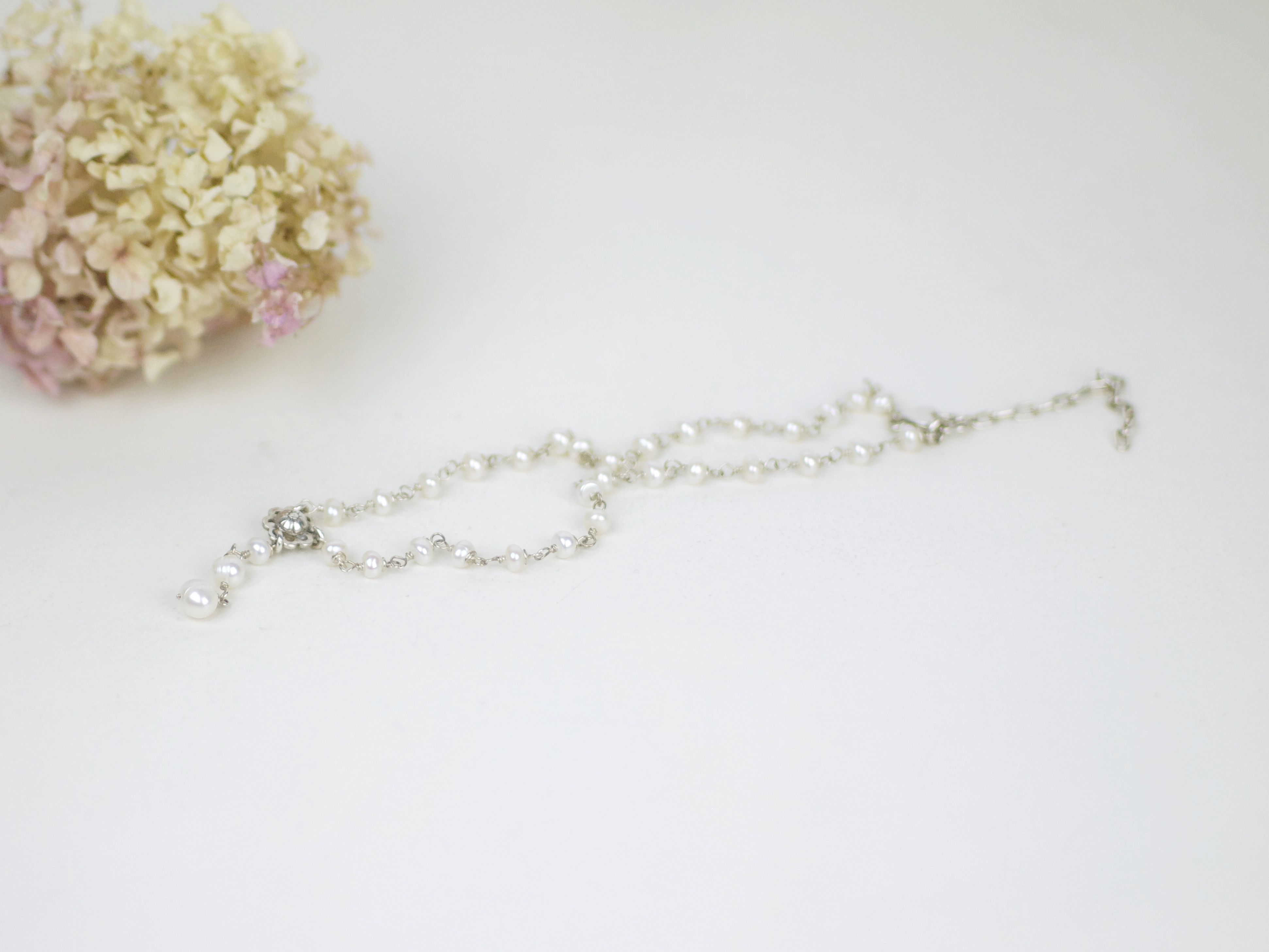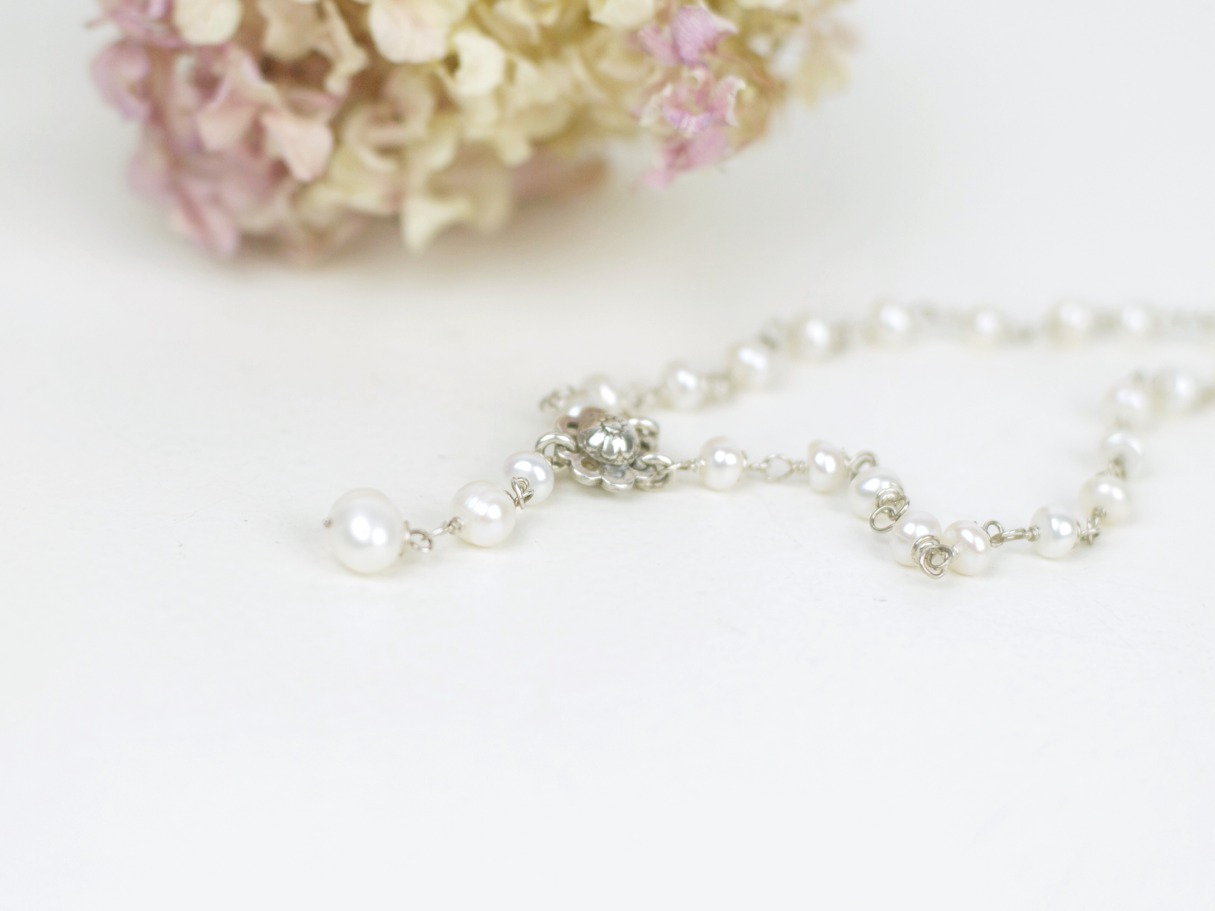 Unikatowy naszyjnik vintage, wykonany ze srebra i pereł słodkowodnych. Zapięcie w formie serca, z możliwością regulacji długości. Długość całkowita 22-28 cm, bez wad.