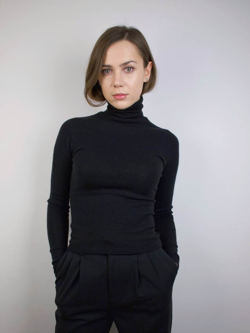 Modelka ma 165 cm wzrostu i nosi rozmiar XS-S. Skład: 70% wełna, 20% jedwab, 10% kaszmir.