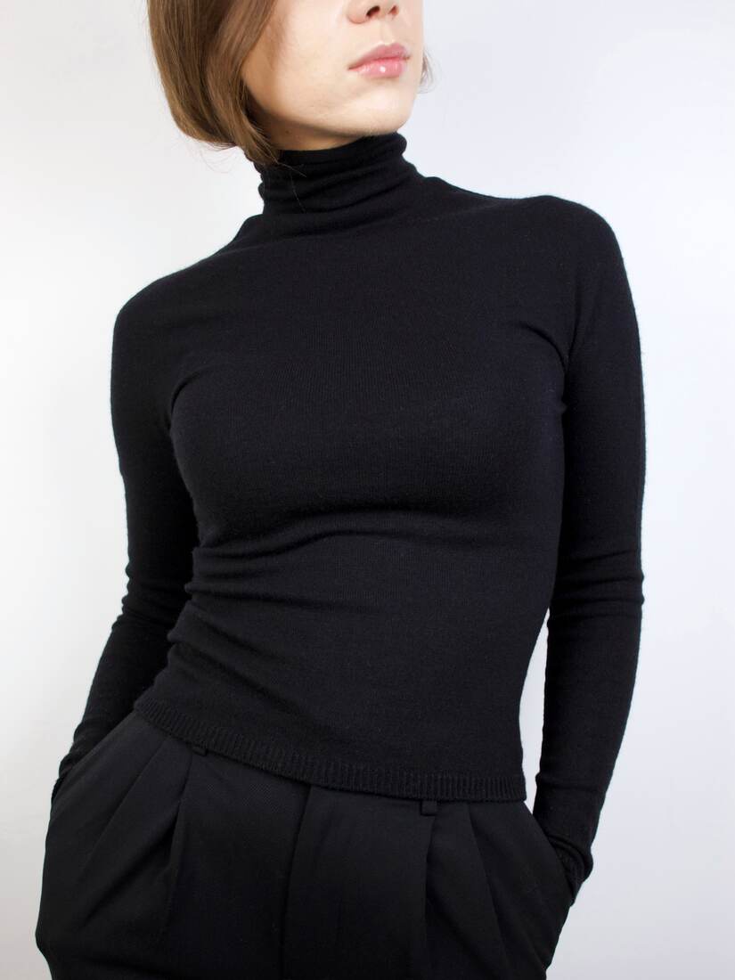 Dopasowany wełniany golf. Brak metek ze składem, jest to wełna, możliwie z dodatkiem elastanu. Polecam na XS, bez wad.