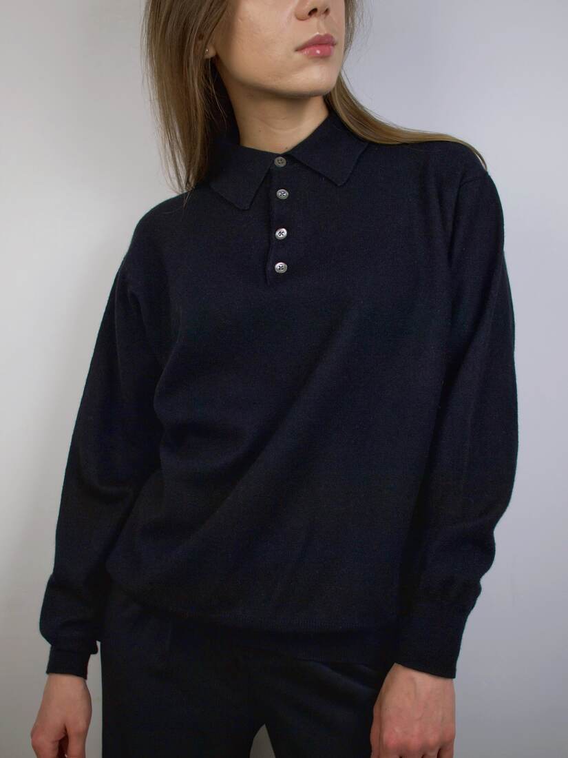 Sweter polo marki Gianni Bugli Milano. Wykonany z szlachetnej mieszanki wełny, jedwabiu i kaszmiru. Brak metki z rozmiarem, polecam na M-L, lub na mniejsze jako oversize. Sweter jest delikatnie sfilcowany, nie jest to widoczne i nie wpływa na jakość użytkowania, nadal jest mięciutki i miły w dotyku. Poza tym bez wad.