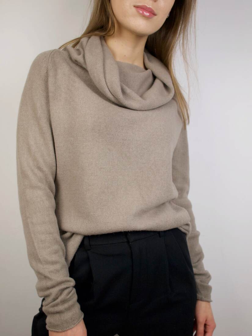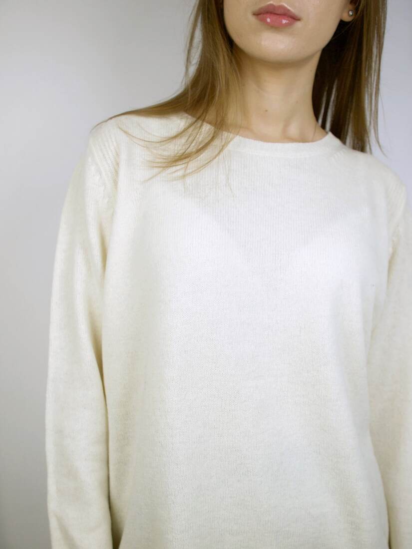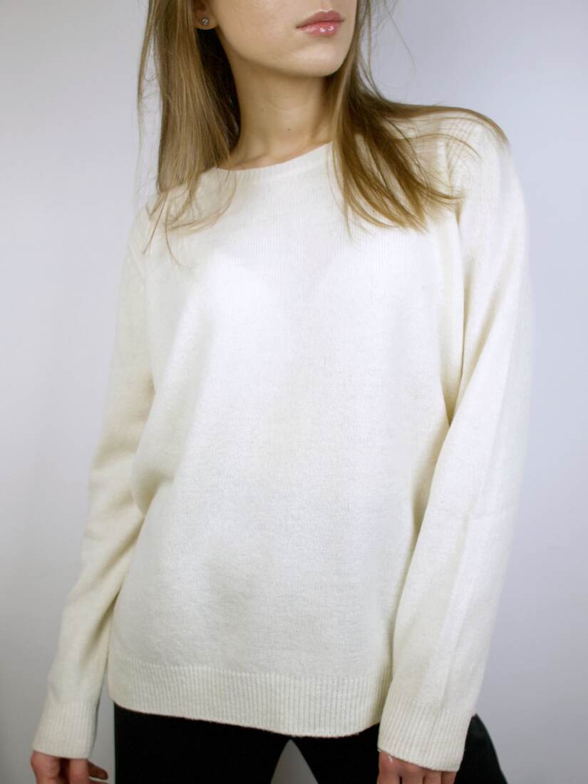 Modelka ma 165 cm wzrostu i nosi rozmiar XS-S. Skład: 100% kaszmir.