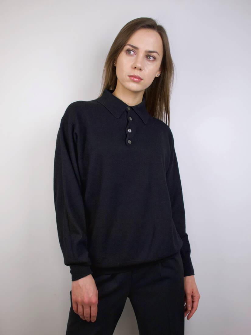 Sweter polo marki Gianni Bugli Milano. Wykonany z szlachetnej mieszanki wełny, jedwabiu i kaszmiru. Brak metki z rozmiarem, polecam na M-L, lub na mniejsze jako oversize. Sweter jest delikatnie sfilcowany, nie jest to widoczne i nie wpływa na jakość użytkowania, nadal jest mięciutki i miły w dotyku. Poza tym bez wad.