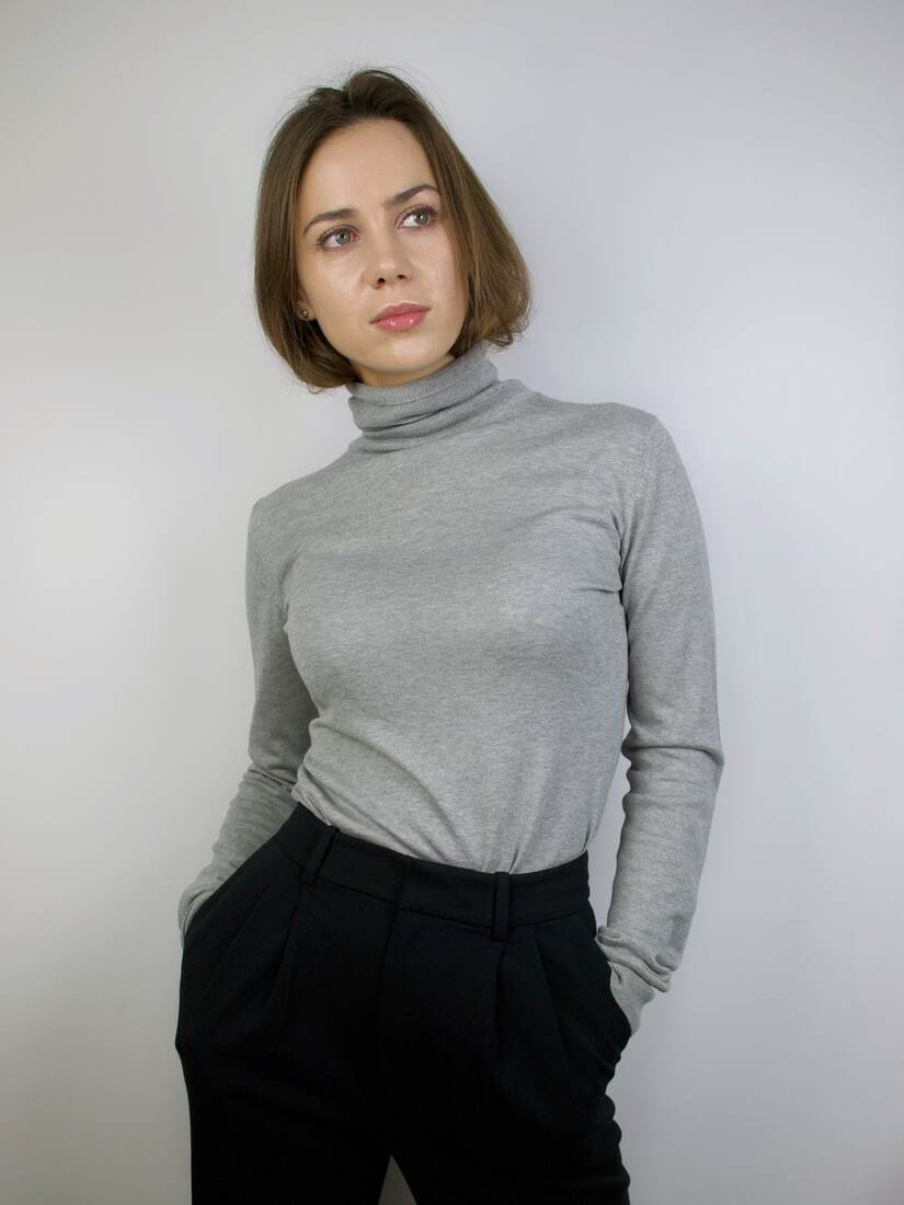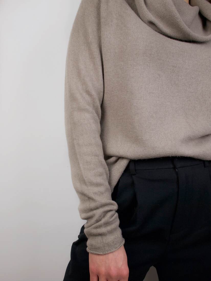 Modelka ma 165 cm wzrostu i nosi rozmiar XS-S. Skład: 70% wełna, 20% jedwab, 10% kaszmir.