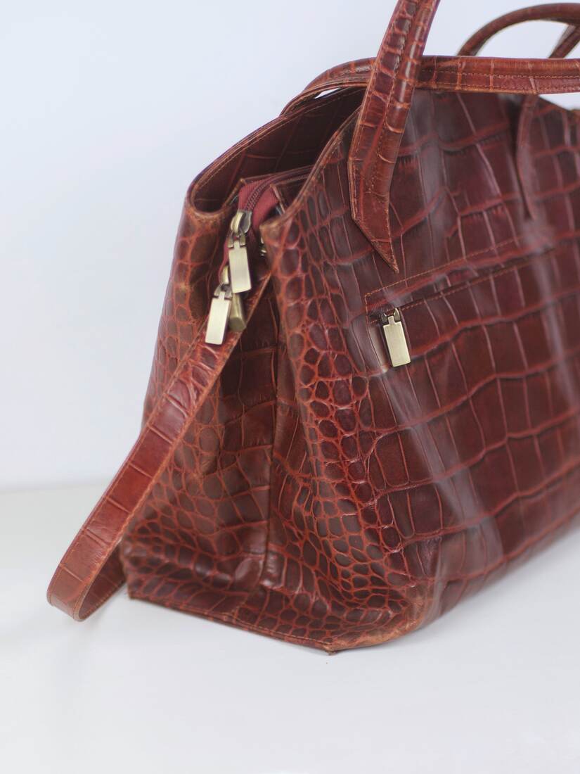 140,00 złPojemna torebka vintage, wykonana ze sztywnej skóry tłoczonej na wzór skóry krokodyla. W środku dwie komory oraz kieszonka na telefon. Posiada odpinany pasek na ramie. Bardzo dobry stan, delikatne wytarcia skóry nie widoczne w noszeniu. Wymiary: wysokość 30 cm, szerokość 37 cm, głębokość 16 cm, wysokość z rączką 42 cm.
