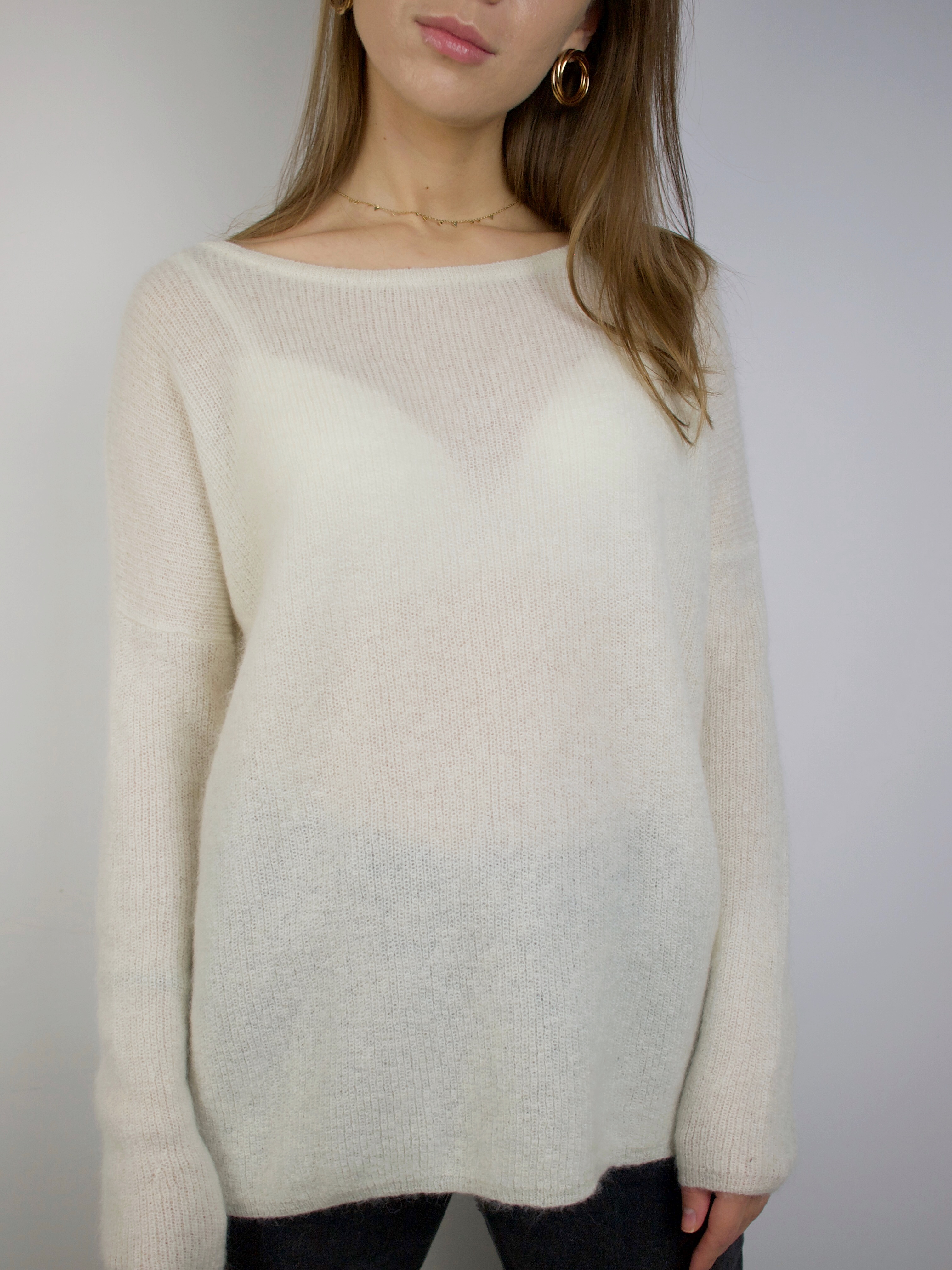 Modelka nosi rozmiar XS-S. Skład: 37% super kid moher, 37% alpaka, 26% poliamid.Szerokość w klatce 55 cm