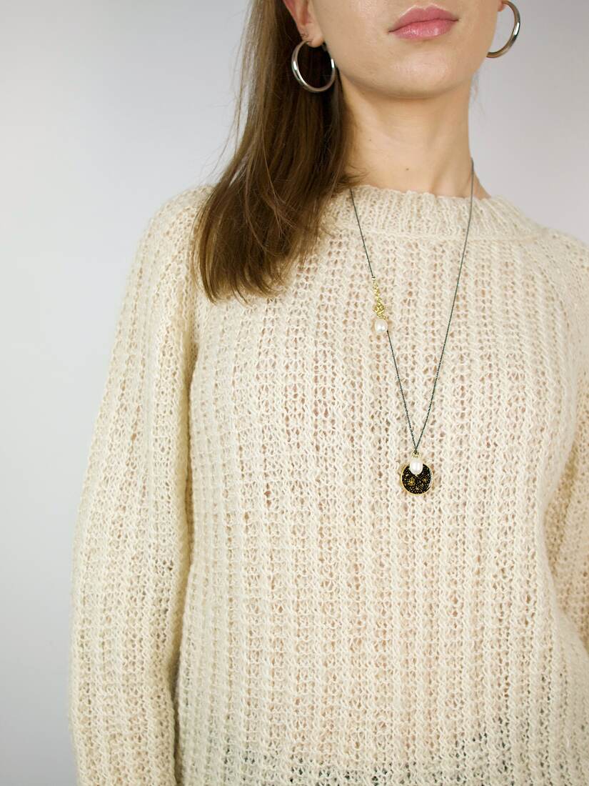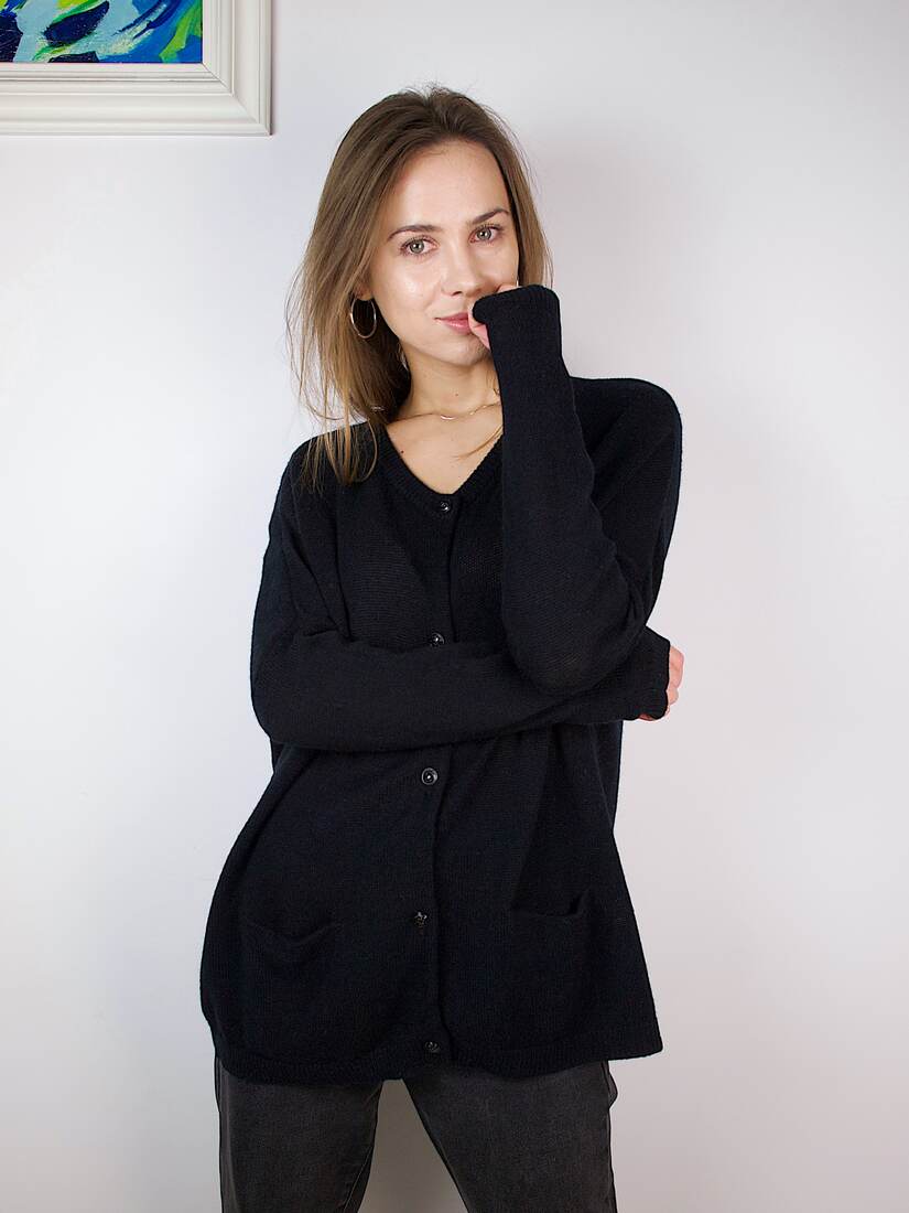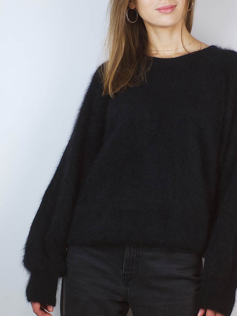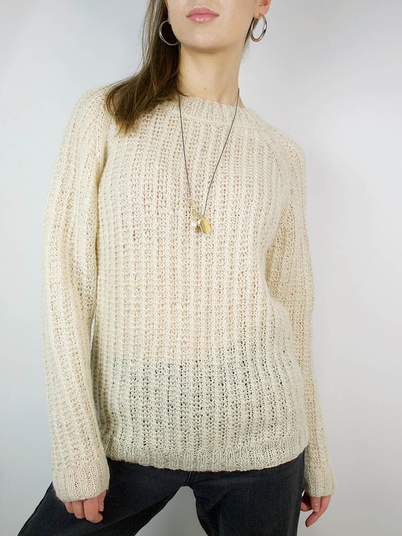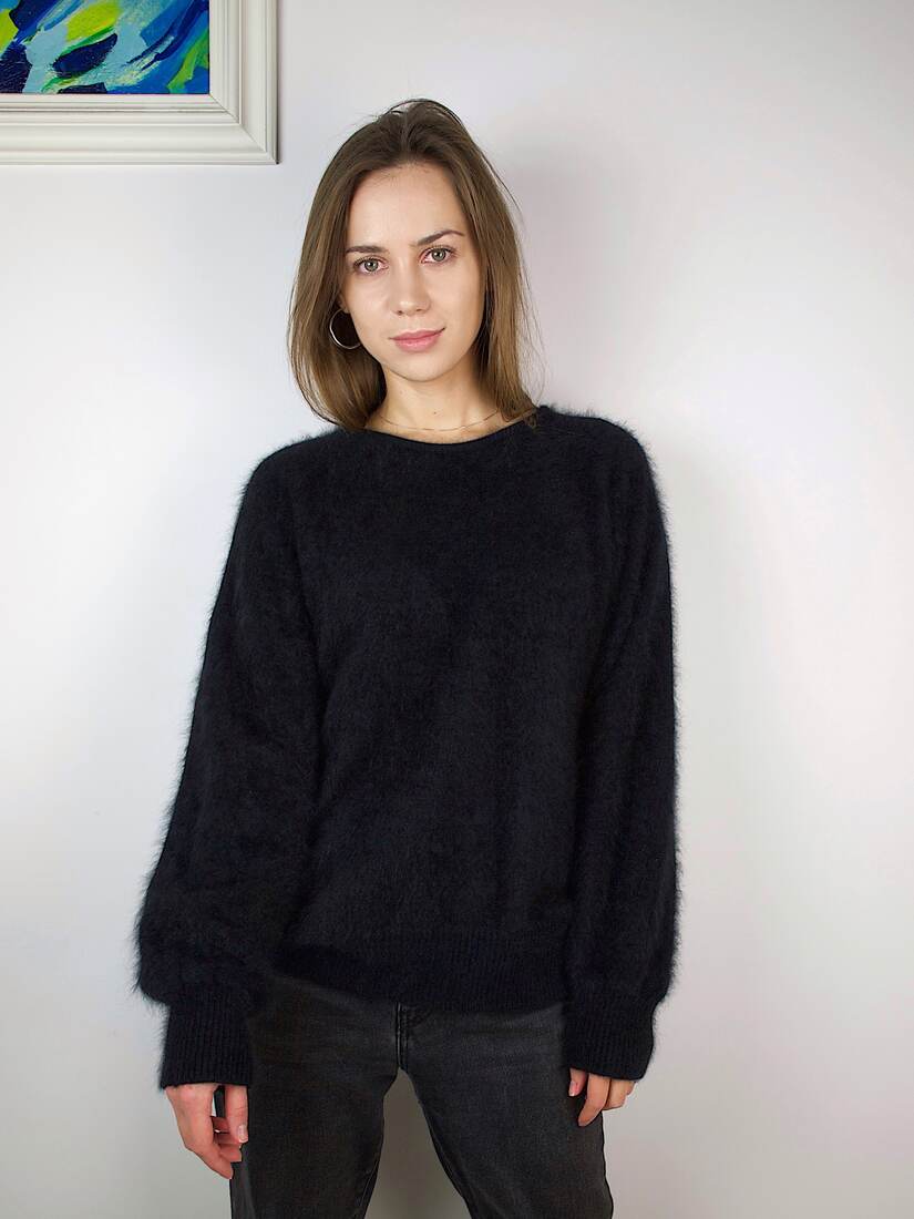 150,00 złUnikatowy sweter vintage wykonany z angory. Bardzo puszysty i miękki. Sweter ma obszerny krój, nieco poszerzane rękawy, z tyłu zapięcie na jeden guzik. Uniwersalny rozmiar, bez wad. Skład: 80% angora, 10% wełna, 10% nylon.