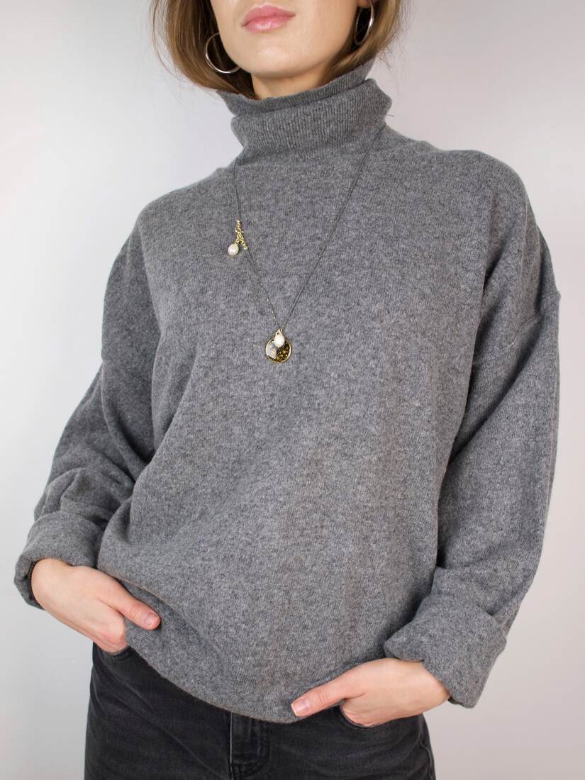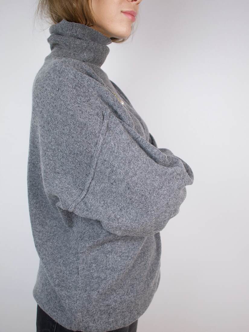 90,00 złWełniany golf z obniżoną linią ramion. Polecam na r.L-XL, na mniejszych dobrze wygląda jako oversize. Ma dwa malutkie zacerowania, absolutnie nie widoczne. Poza tym bez wad.