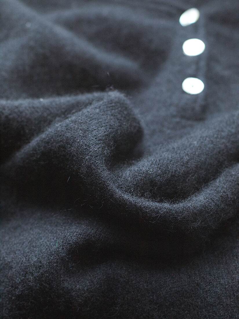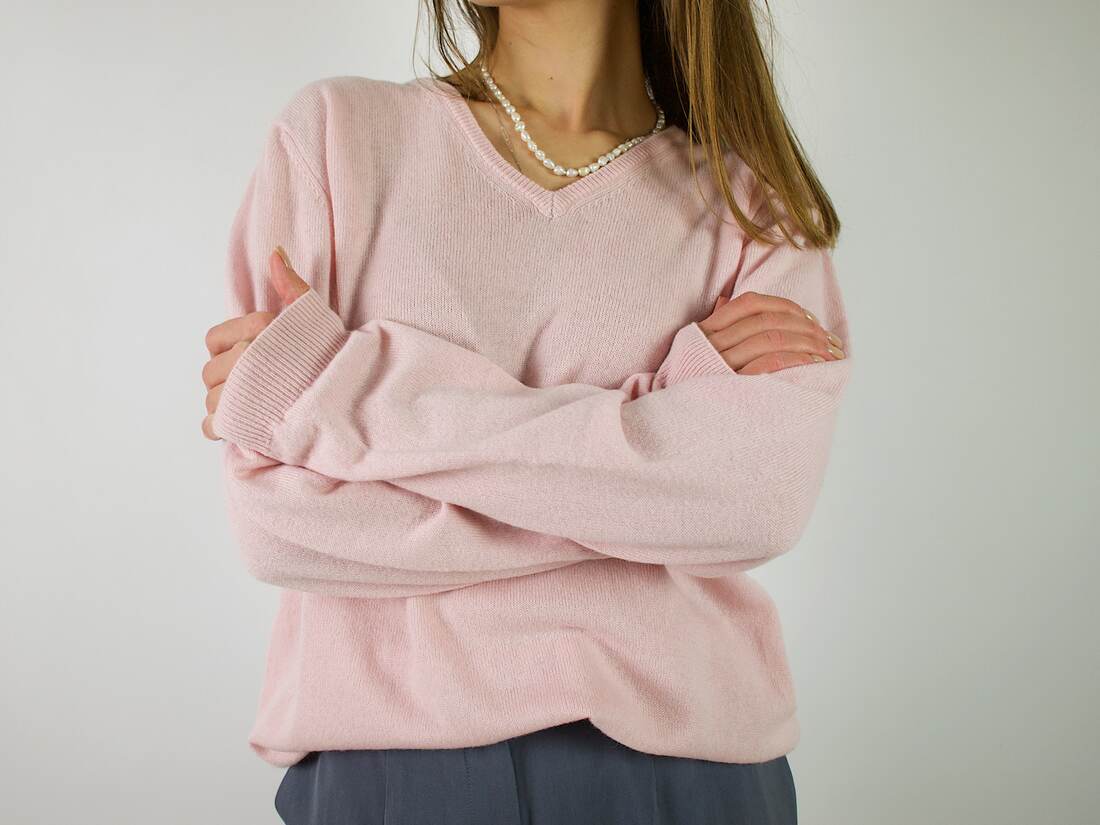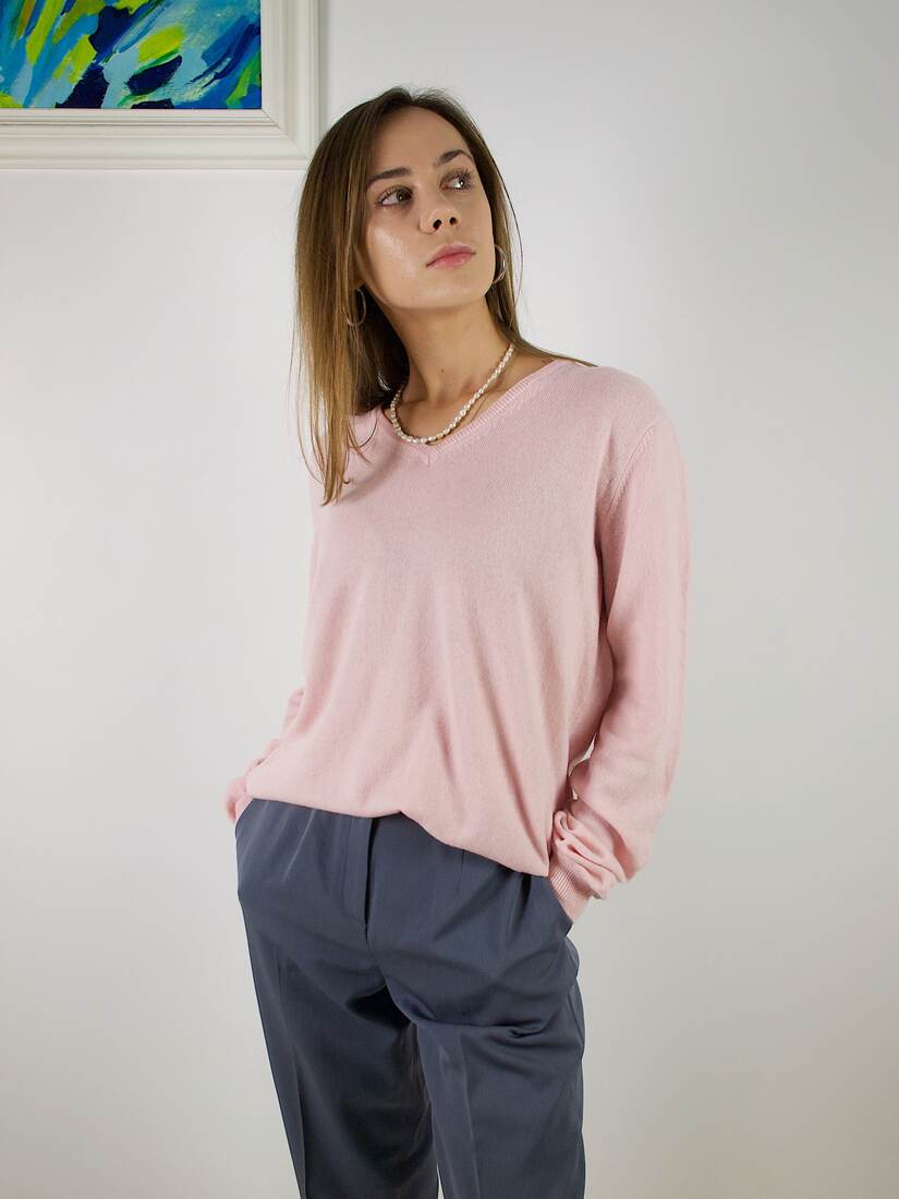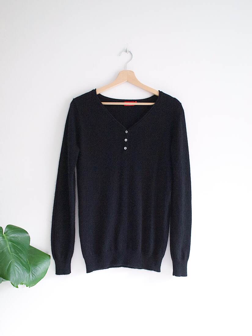 Sweter vintage w 100% wykonany z miękkiego puszystego kaszmiru. Przy dekolcie ozdobne guziki z masy perłowej, łaty na łokciach.    Rozmiar z metki 42/44, jednak realnie jest to najwyżej rozmiar M, na większe będzie obcisły. Bez wad.