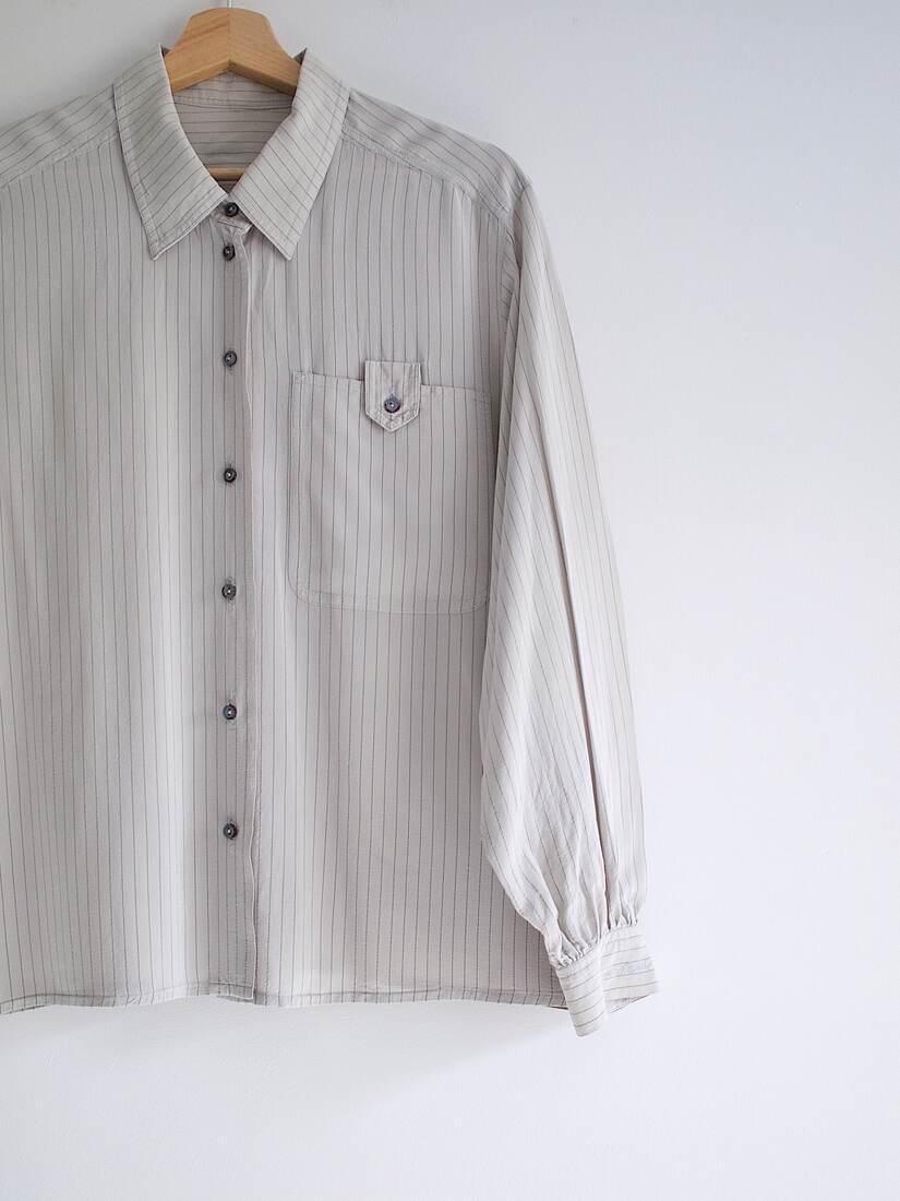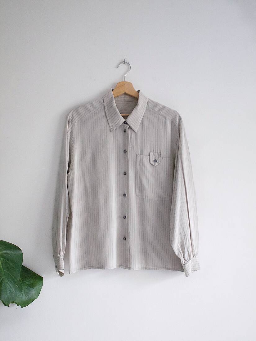 Jedwabna koszula w kolorze pastelowej szarości. Dom mody Etienne Aigner, unikatowy model vintage, Made in West Germany. Rozmiar z metki M, dość luźna. Bardzo dobry stan, delikatne przebarwienia pod pachami, absolutnie nie widoczne w noszeniu.