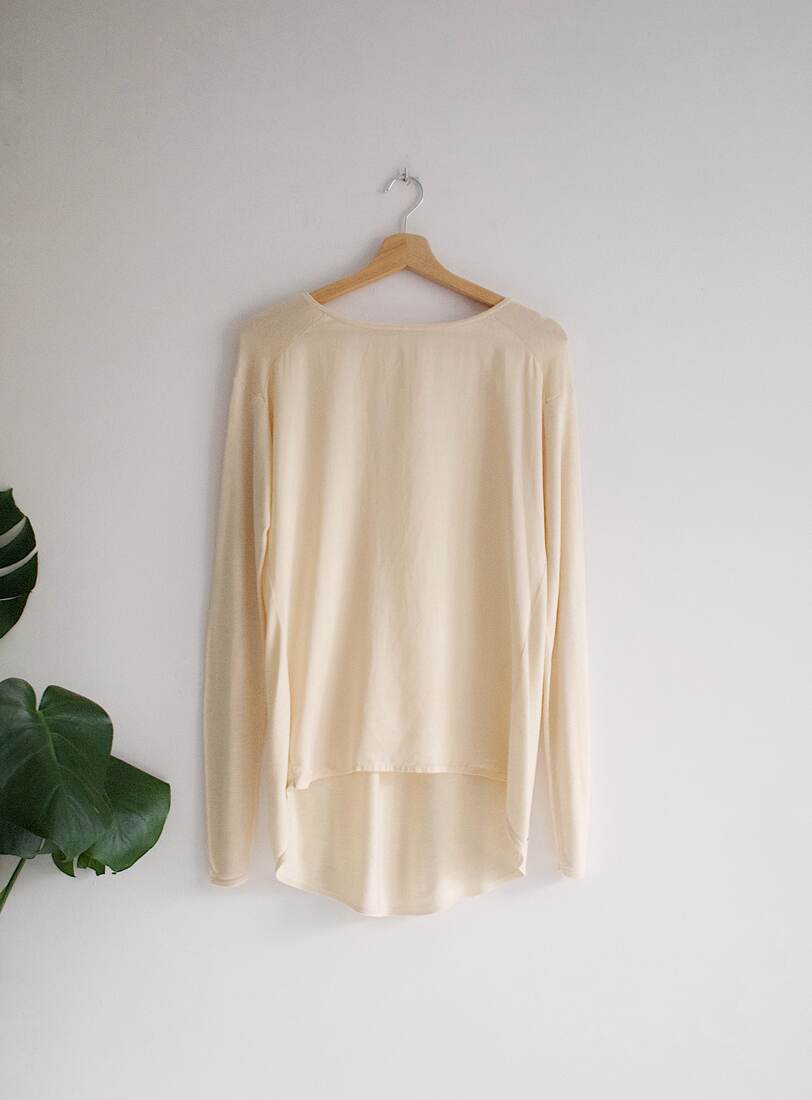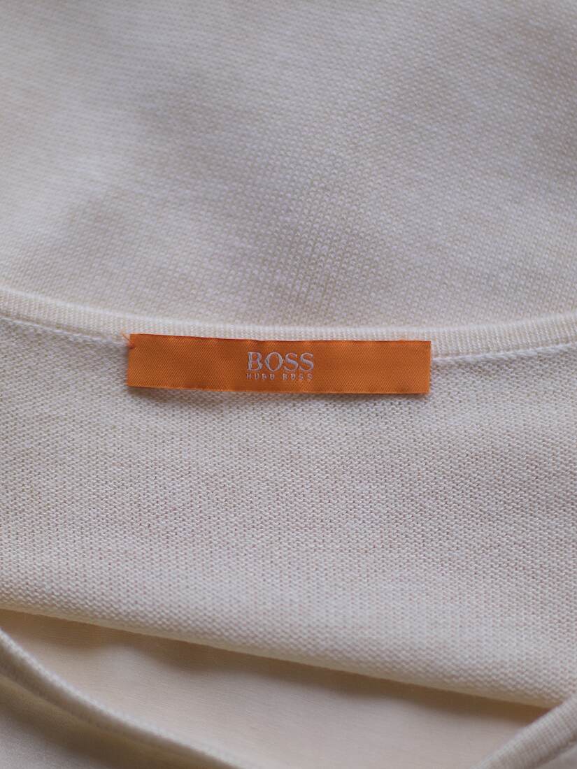 Sweterek renomowanej marki Hugo Boss w kolorze waniliowym. Wykonany z łączonych materiałów, przód z jedwabiu, tył i rękawy z wełny merynosa. Brak metki z rozmiarem, polecam na S-M, proszę sugerować się wymiarami. Bez wad.