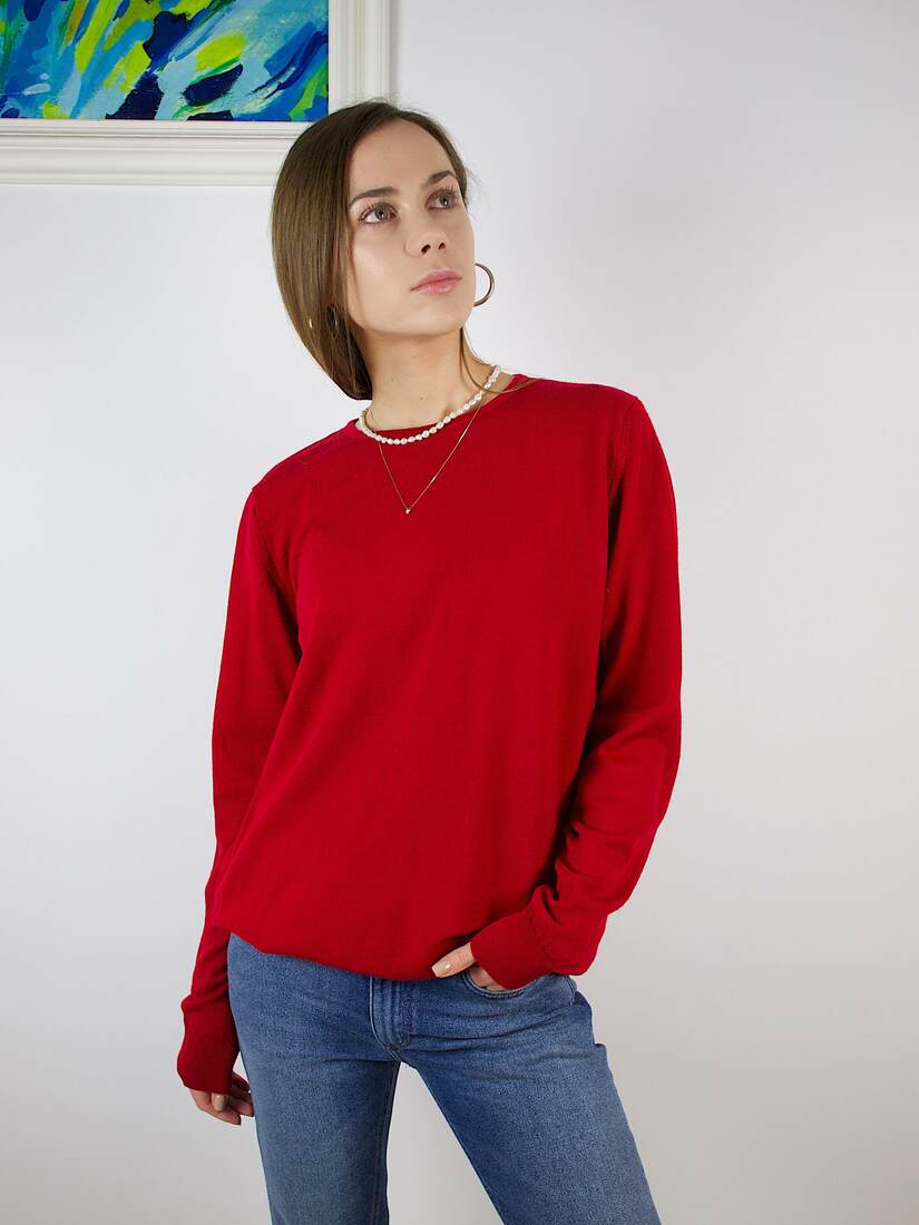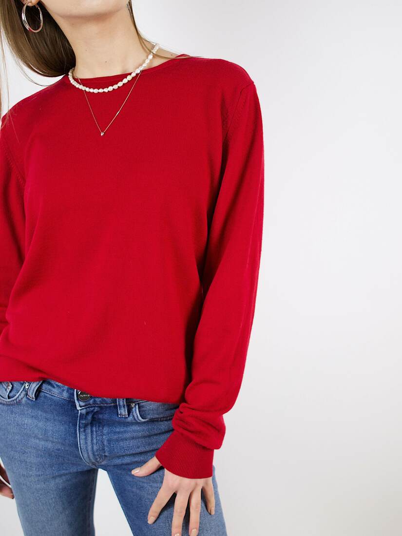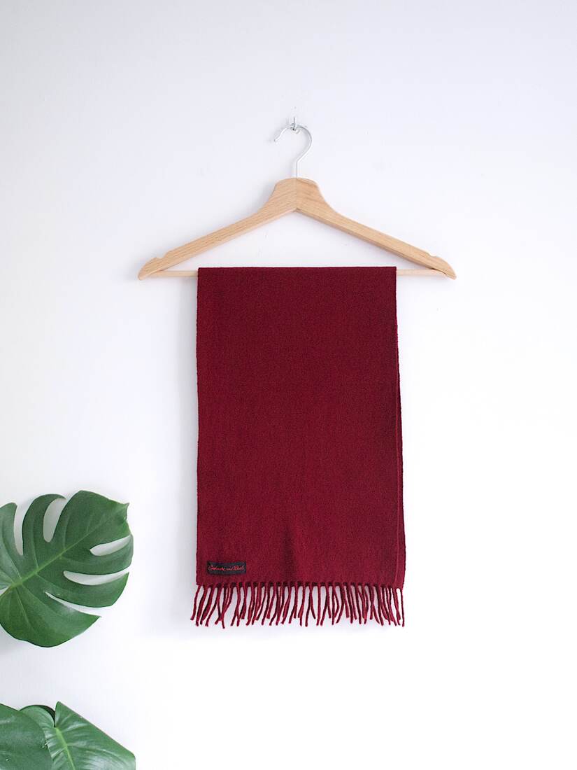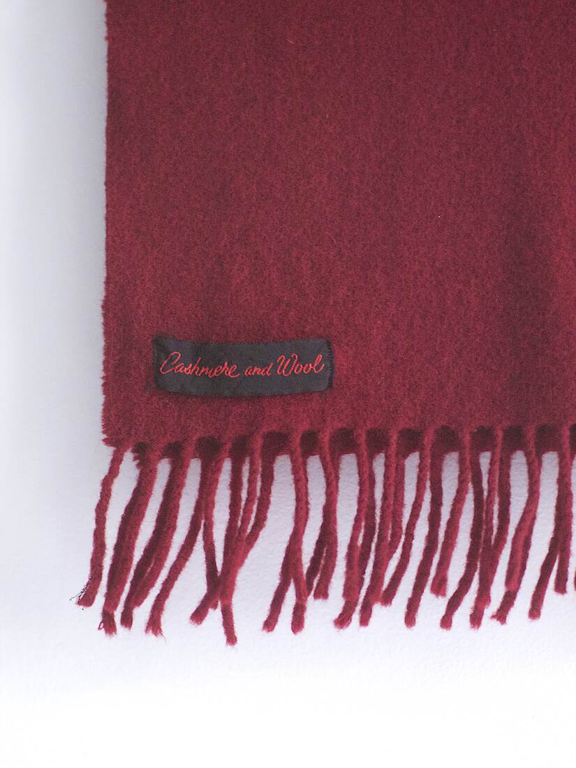 Szalik vintage, wykonany z mieszanki wełny i kaszmiru w kolorze wiśniowym. Brak metki z dokładnym składem, poza tym bez wad. Wymiary bez frędzli 113*26 cm.