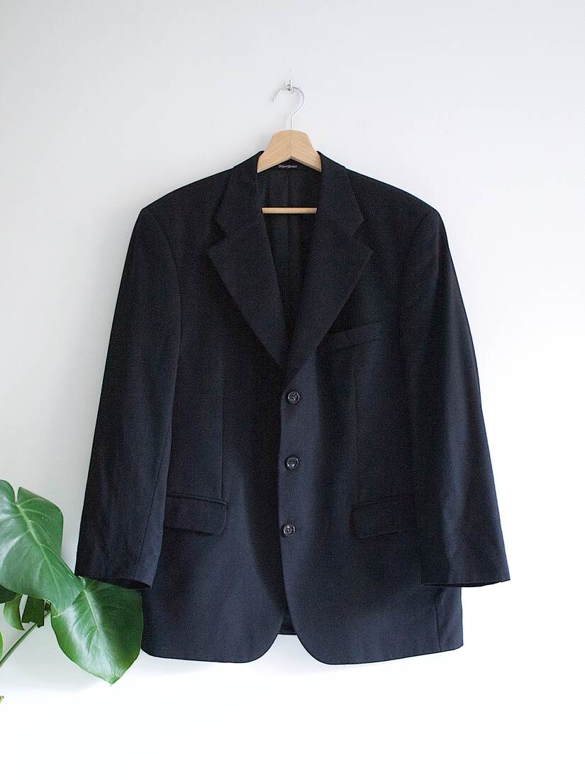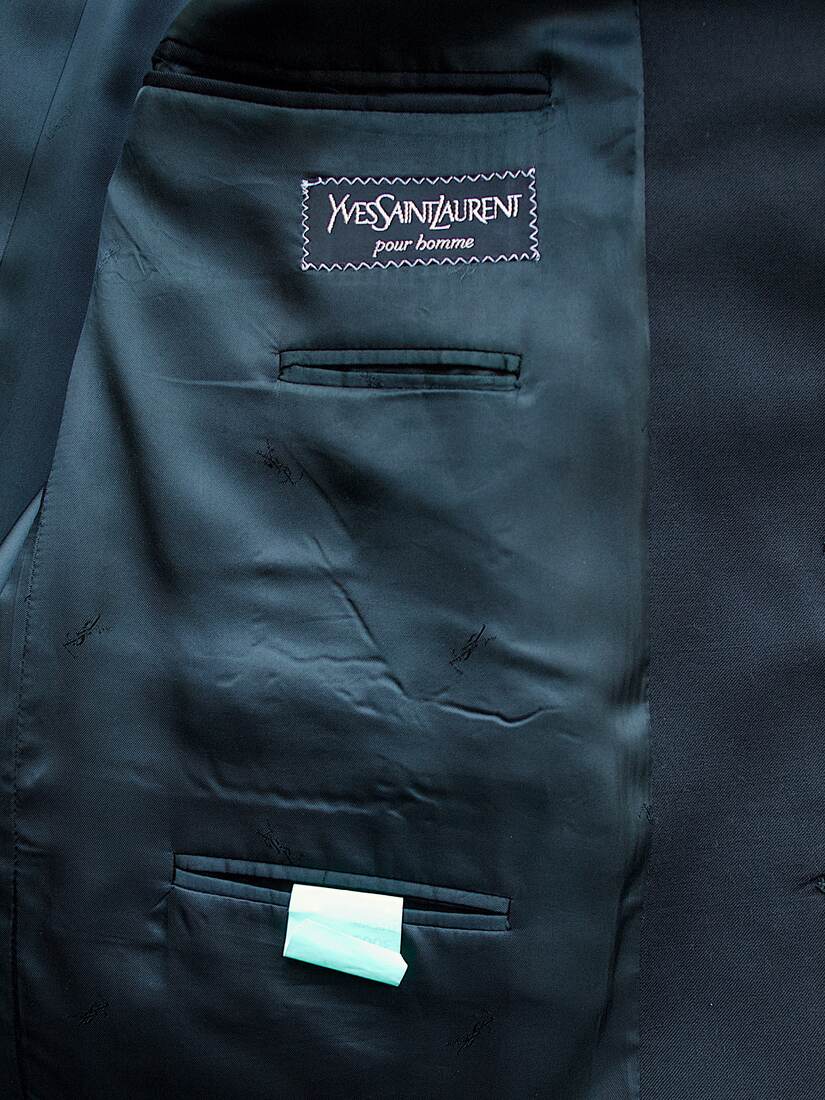 Męska wełniana marynarka domu mody Yves Saint Laurent. Obszerna, idealna do stylizacji oversize. W ramionach poduszki. Marynarka ma na kołnierzu wyświecenia po żelazku, i lekko uszkodzony materiał przy zapięciu. Poza tym bez wad, po czyszczeniu.
