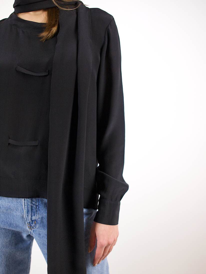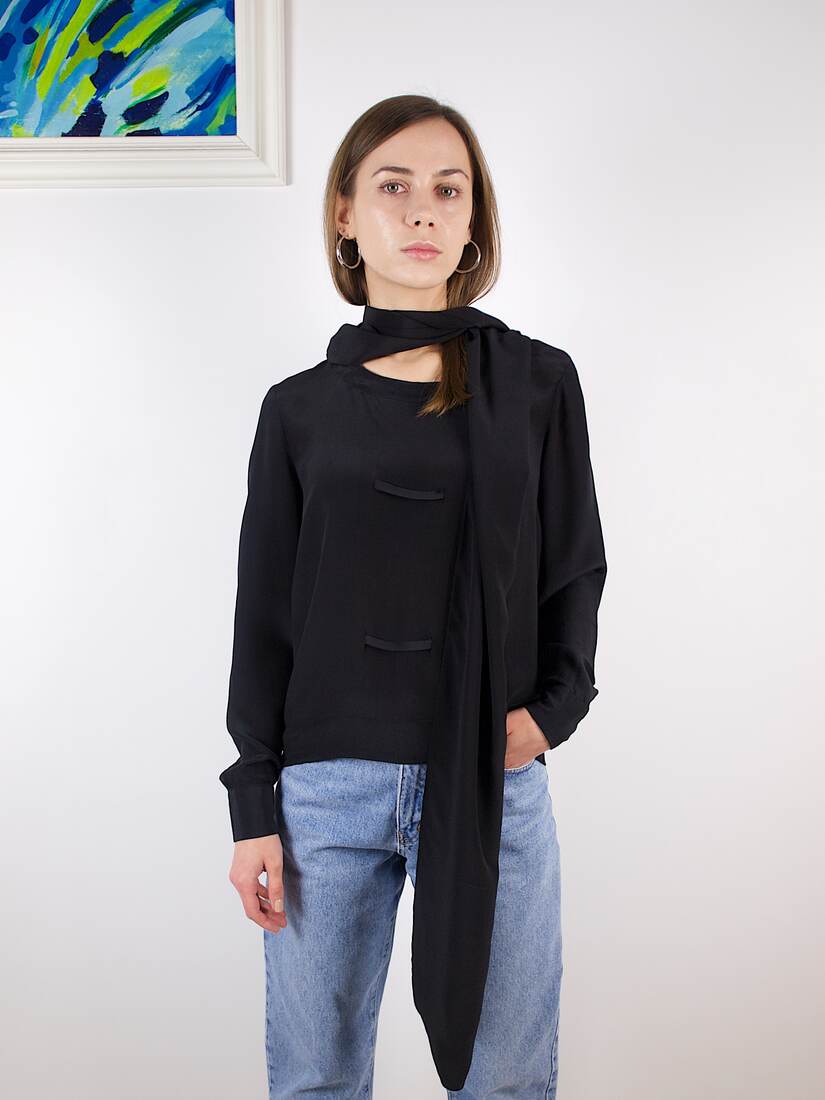 Jedwabna bluzka luksusowej amerykańskiej marki Rodebjer, cena katalogowa ponad 200 euro. Ciekawy fason z długim wiązaniem, które można układać na różne sposoby. Skład to 100% matowy jedwab, rozmiar S, bardzo dobry stan.