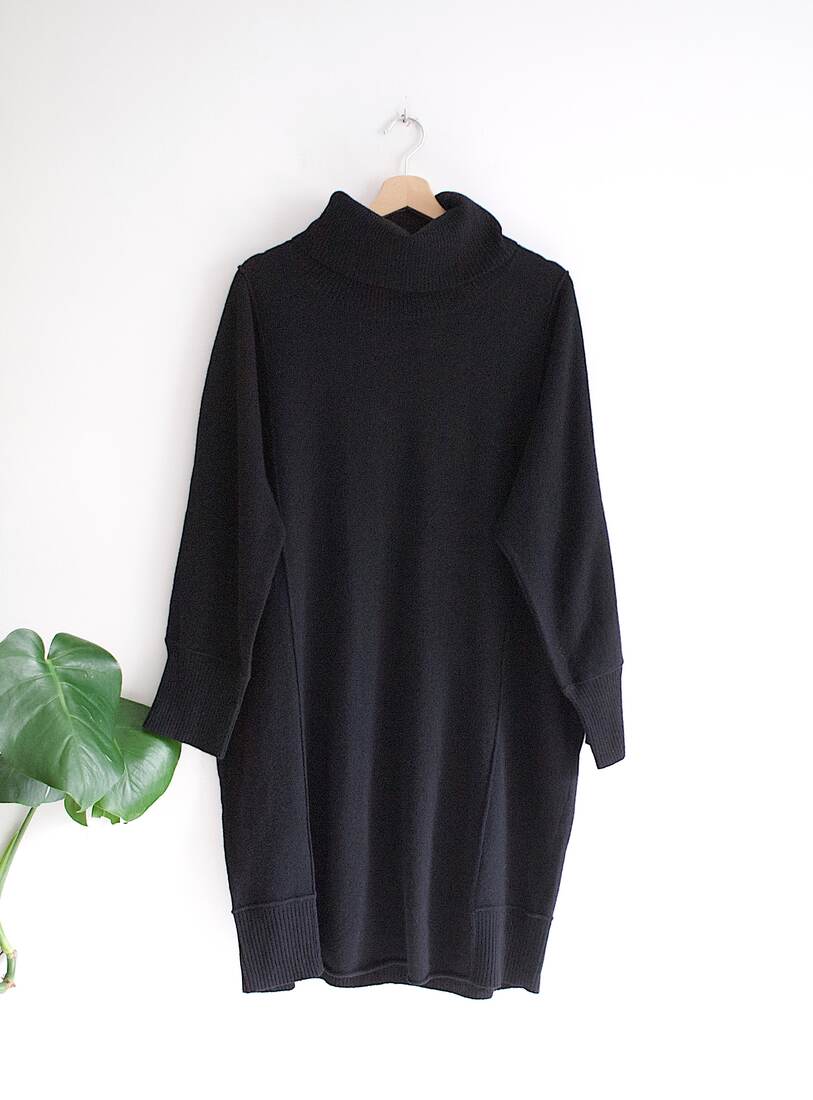Obszerna wełniana sukienka z golfem. Rękawy wykończone ściągaczem. Rozmiar z metki XL, jednak na mniejszych fajnie wygląda jako oversize. Bez wad.