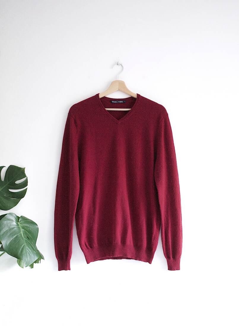 Bordowej sweter brytyjskiej marki WoolOvers. Wykonany z miękkiej wełny merynosa z dodatkiem kaszmiru. Rozmiar z metki S, jest dość luźny, więc będzie pasować na M-L. Bez wad.