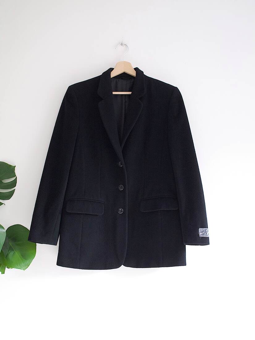 Czarna klasyczna marynarka, niezbędny basic w każdej szafie. Prosty, nieco luźniejszy krój. Wysoka jakość wykonania, wyprodukowana we Włoszech. Marynarka nie była noszona, na rękawie ma jeszcze metkę, którą należy odpruć przed noszeniem. Rozmiar z metki 36, odświeżona w pralni chemicznej i gotowa do noszenia.