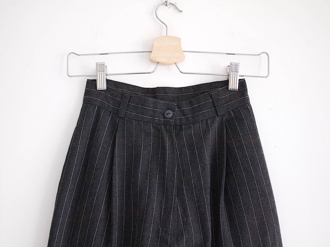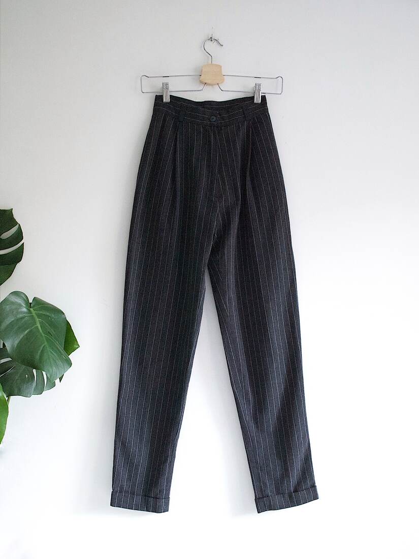 Eleganckie spodnie vintage. Zawężane w talii, z kieszeniami, nogawka zwężana ku dołowi. Metka ze składem nie jest czytelna, materiał przypomina bawełnę, możliwie z małym dodatkiem wełny. Bardzo wąskie w talii, polecam na rozmiar XS. Bez wad.