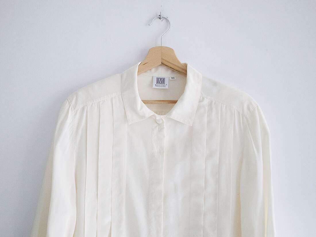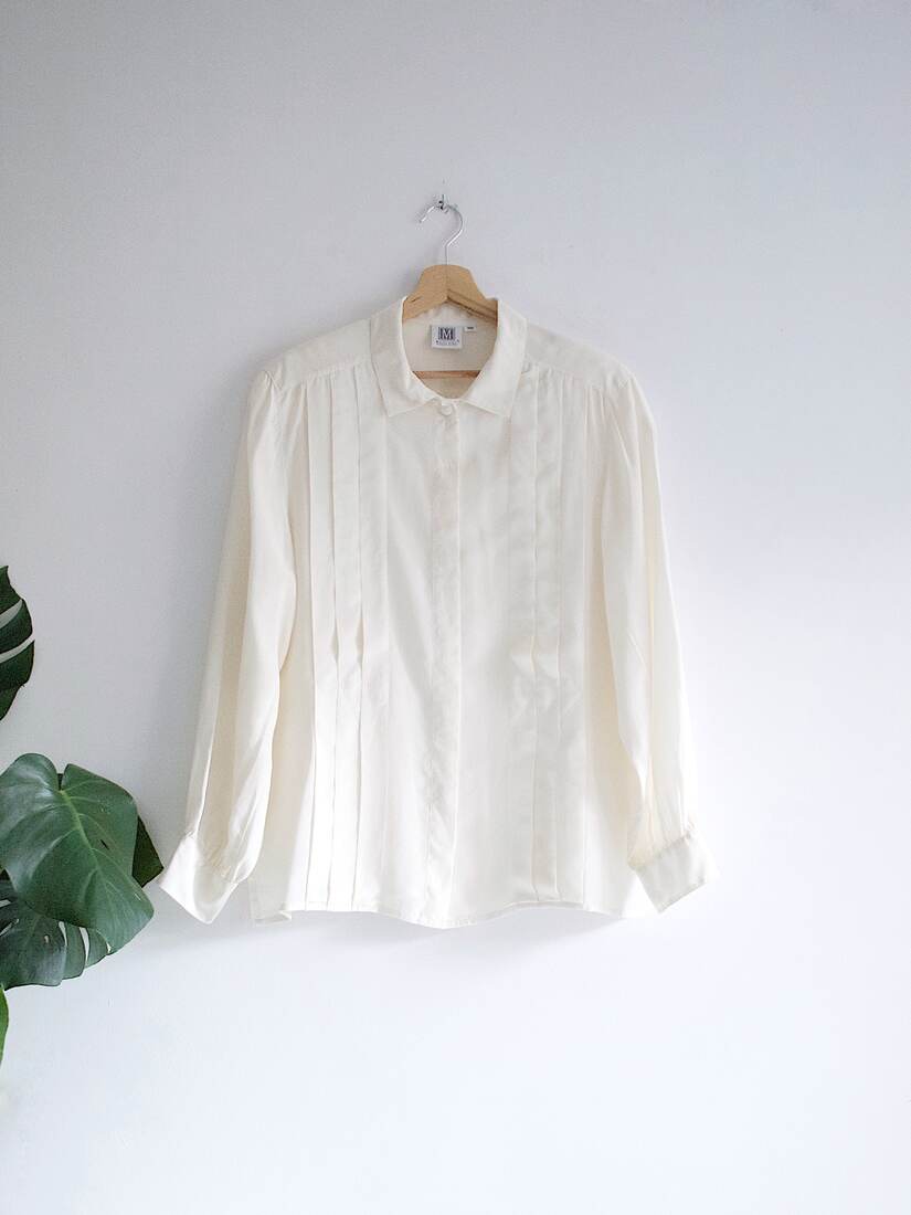 Jedwabna koszula vintage. Z przodu ma ozdobne plisy, rękawy nieco poszerzane. W ramionach są poduszki, bezproblemowo można odpruć samodzielnie. Rozmiar z metki 42, docelowo będzie pasować na L-XL, na mniejsze jako oversize. Bez wad.