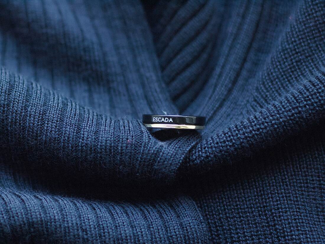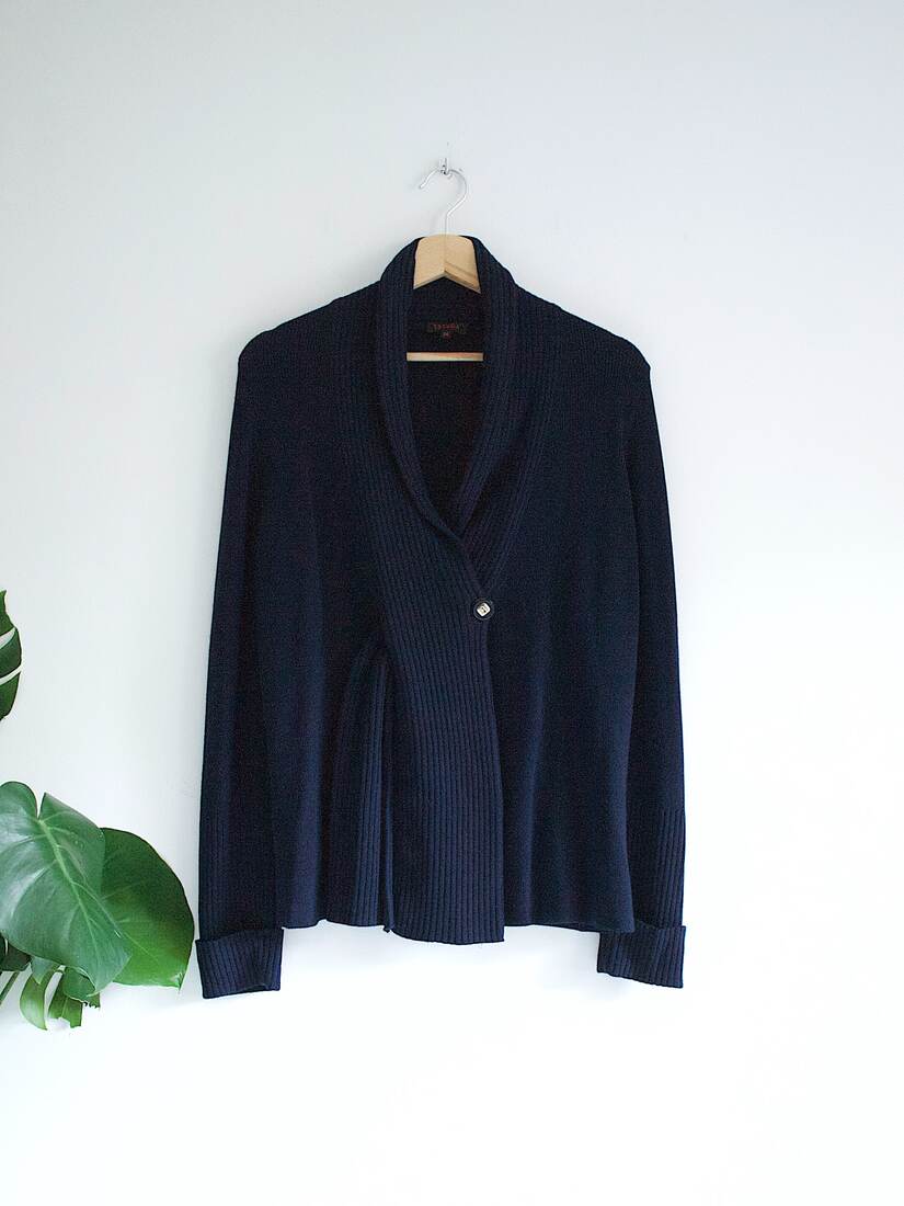 Kardigan domu mody Escada w głębokim granatowym kolorze. Wysoka jakość wykonania, 100% wełna z pierwszego strzyżenia. Zapinany na logowany guzik. Rozmiar z metki 38, idealny stan.