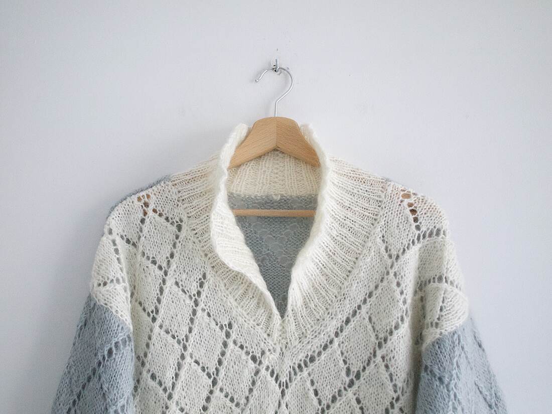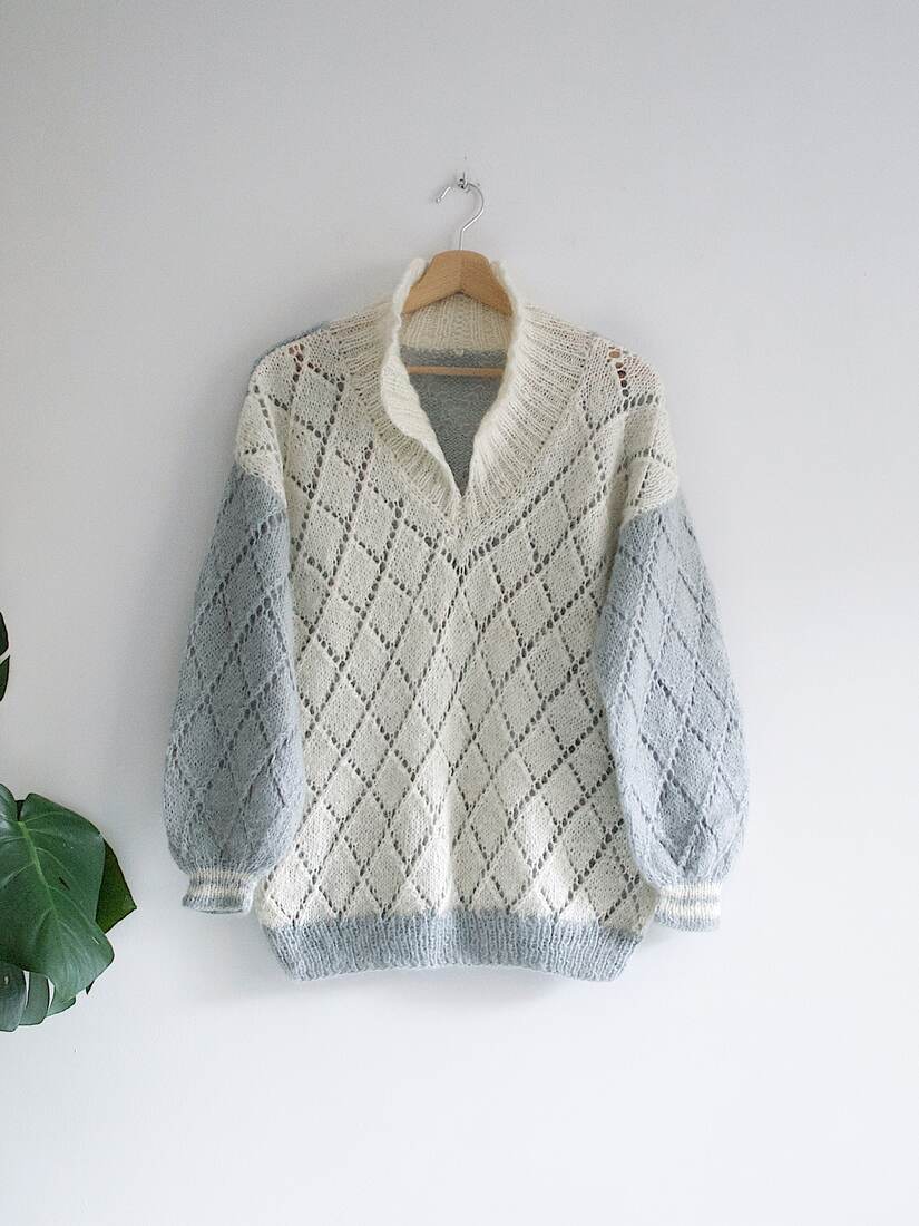 Ażurowy sweter hand made o obszernym kroju. Brak metki ze składem, materiał zawiera wełnę i możliwie moher. Polecam jako one size. Bez wad.