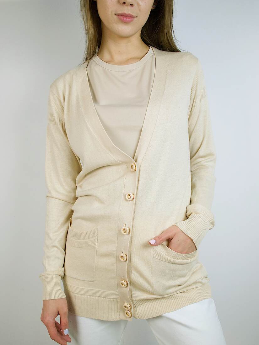 Kardigan w kolorze ciepłego beżu od projektanta Marc Jacobs. Dłuższy fason, zapinany na piękne grube guziki. Dobry skład: 55% jedwab, 40% bawełna, 5% kaszmir. Rozmiar z metki S, będzie pasować także na XS i mniejsze M. Bez wad.