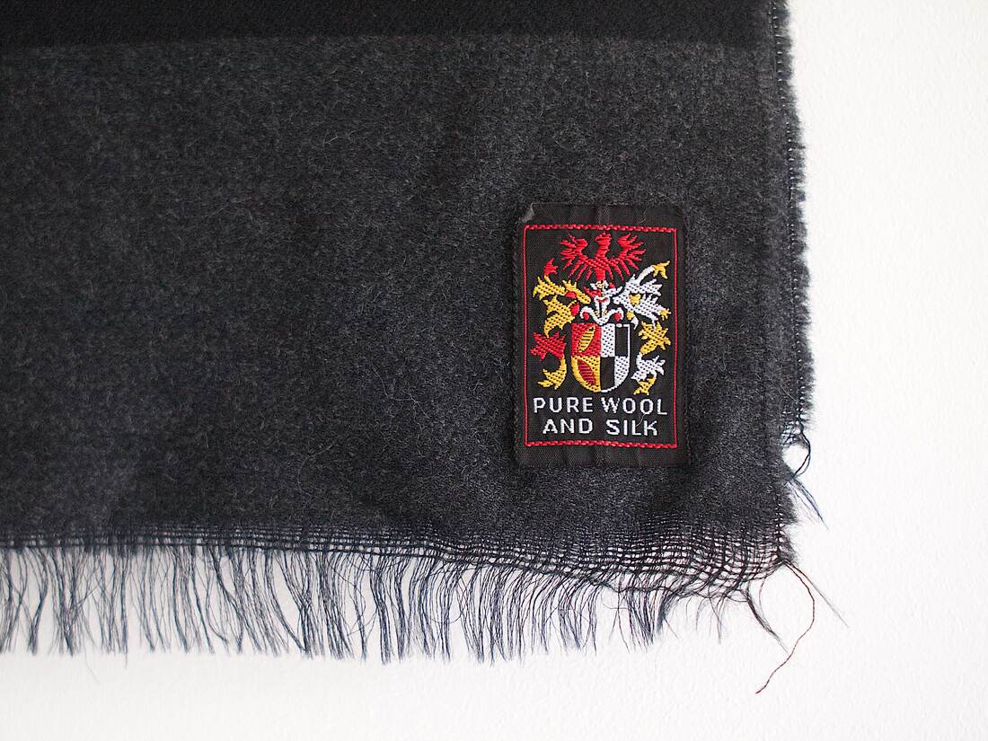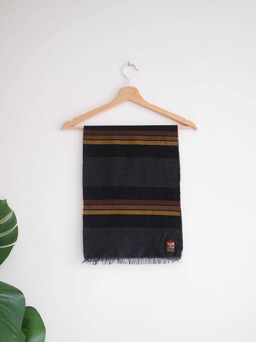 Szalik w paski wykonany z wełny z dodatkiem jedwabiu. Bardzo dobry stan. Wymiary bez frędzli 117*29 cm