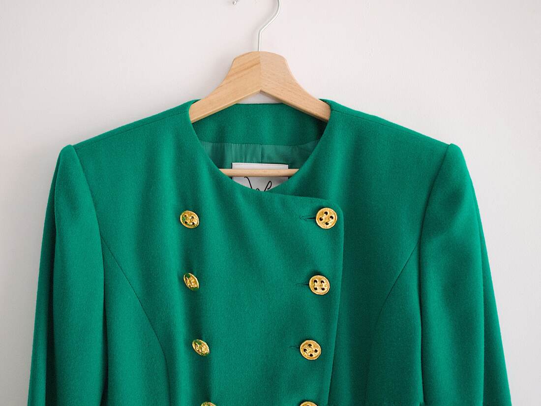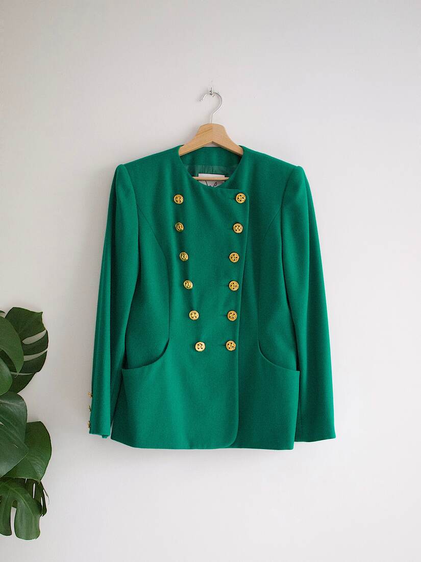 Unikatowa marynarka vintage wyprodukowana we Francji. Prosty fason, ozdobiona metalowymi guzikami. Materiał wierzchni 100% czysta, żywa wełna, podszewka acetat. Rozmiar z metki M, dla luźniejszego dopasowania polecam na XS-S . Bez wad, po czyszczeniu.