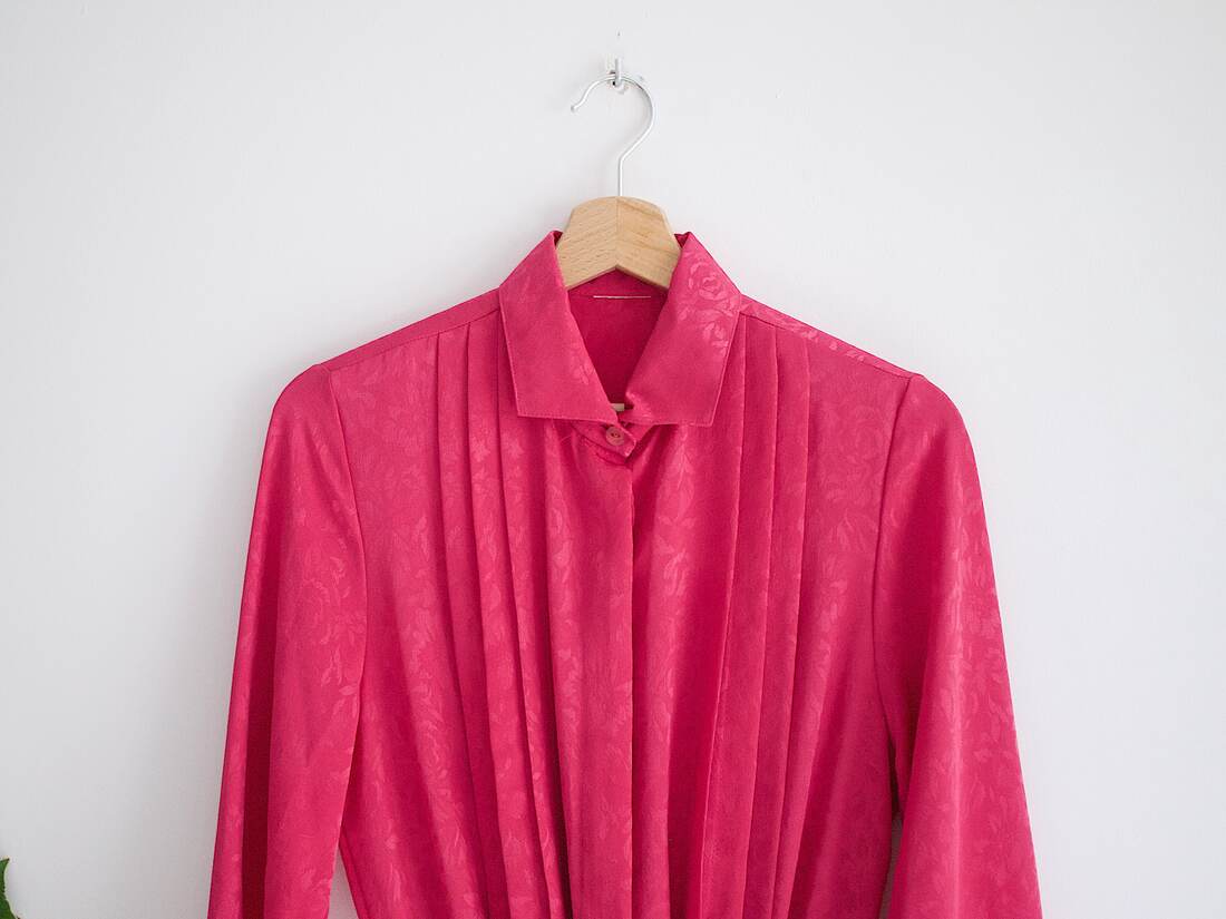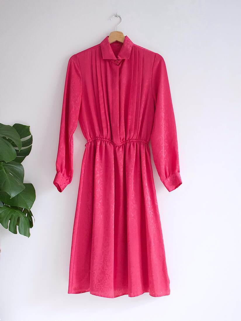 Sukienka vintage w malinowym kolorze. Rozpinana do pasa, w pasie gumka, materiał w wytłaczane kwiatowe wzory. Brak metki ze składem, prawdopodobnie poliester. Będzie pasować na S-M. Bez wad.