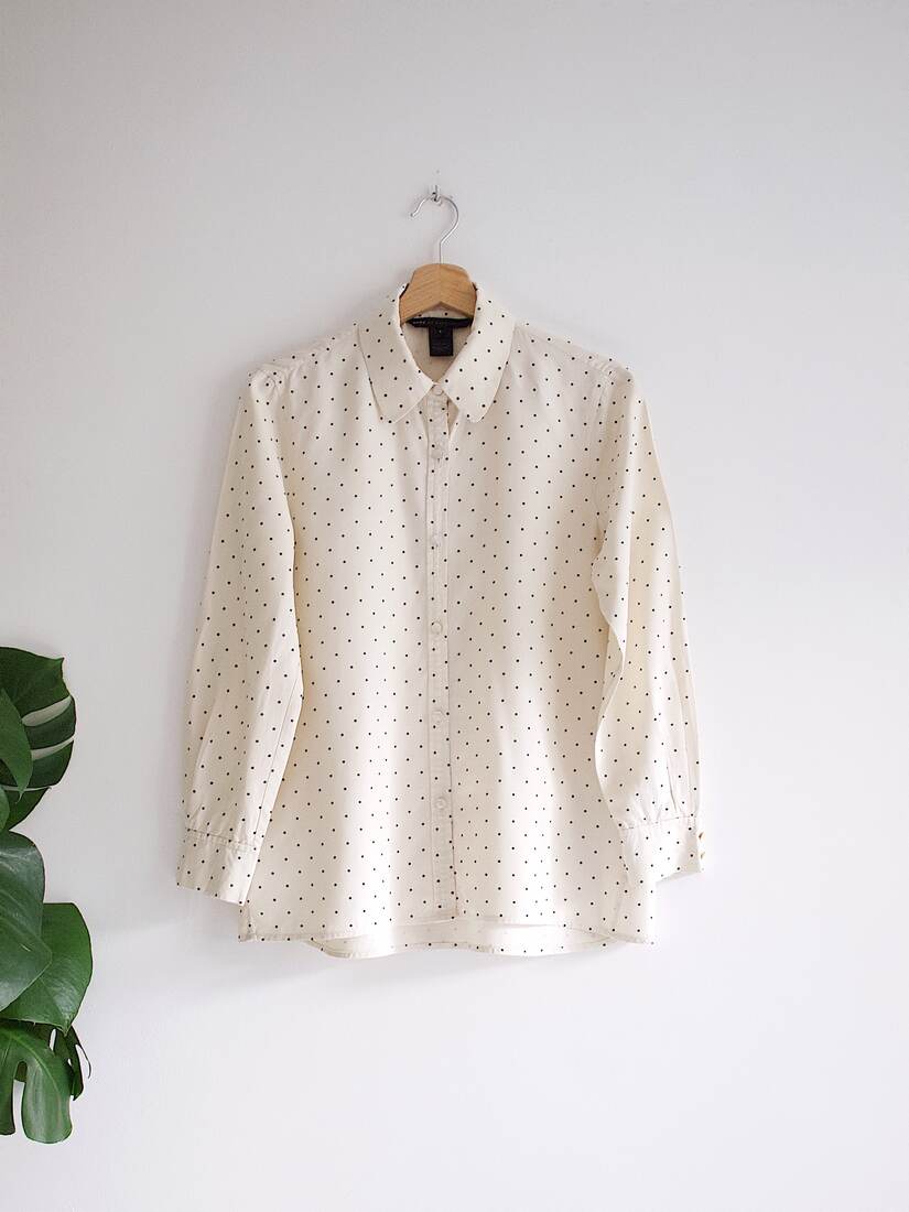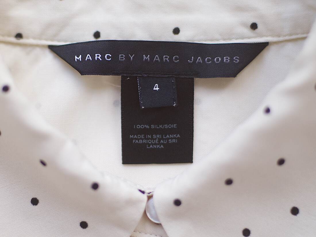 Jedwabna koszula w kropki od projektanta Marc Jacobs, model „Zandra”, cena katalogowa ok 250$. Zapinana na piękne guziki. Koszulka ma delikatne przebarwienia pod pachami od strony wewnętrznej, nie widoczne zewnątrz, poza tym bez wad. Rozmiar z metki 4, będzie pasować na XS-S-mniejsze M.