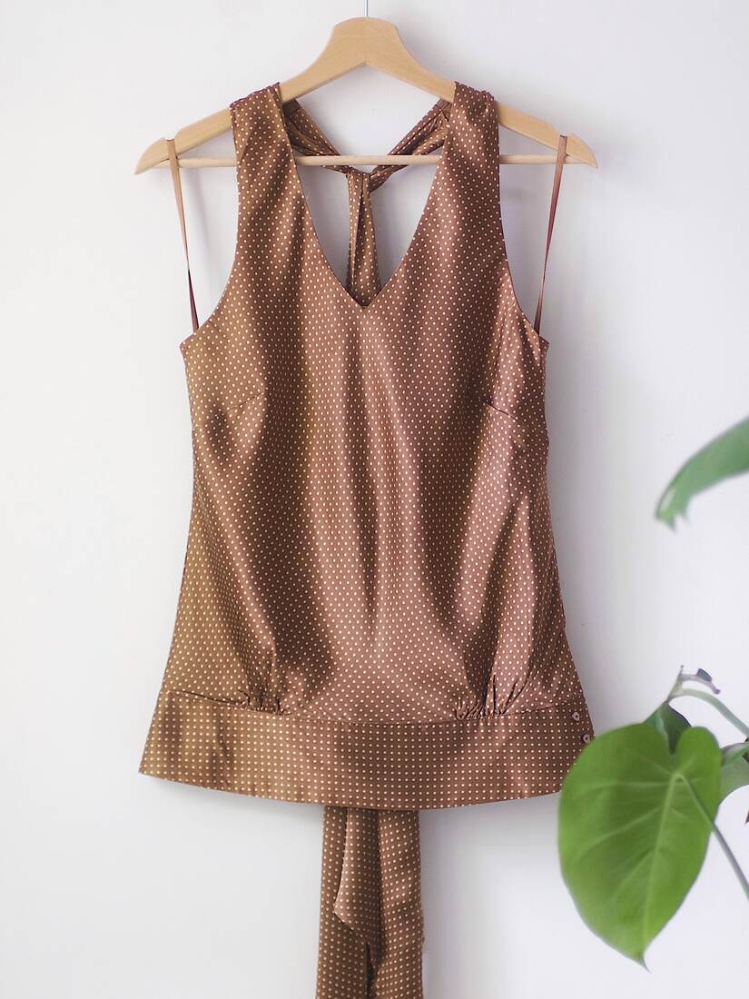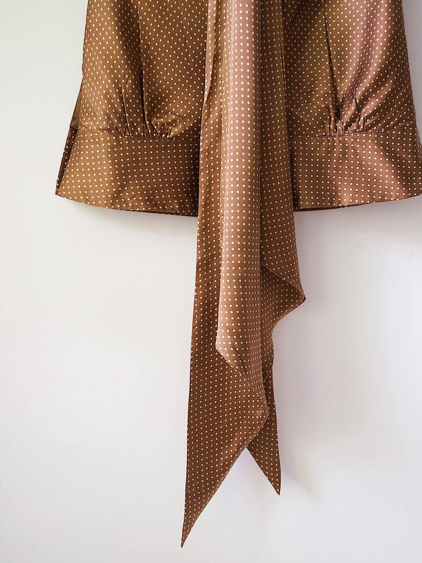 Jedwabny top w groszki z długim wiązaniem z tyłu. Podszewka z acetatu. Rozmiar z metki 12, polecam na XS-S-M, idealny stan.