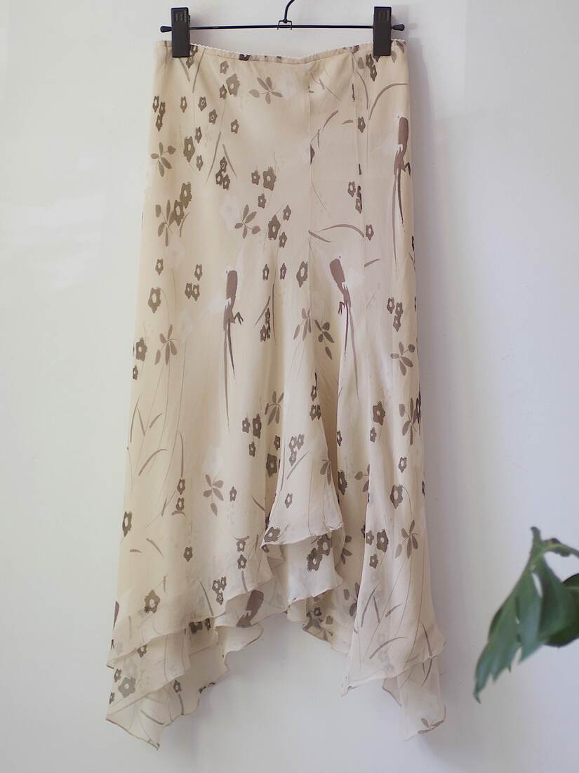 Jedwabna spódnica w kwiaty. Asymetryczny dół, gumka w pasie, z podszewką. Rozmiar z metki S, bez wad.