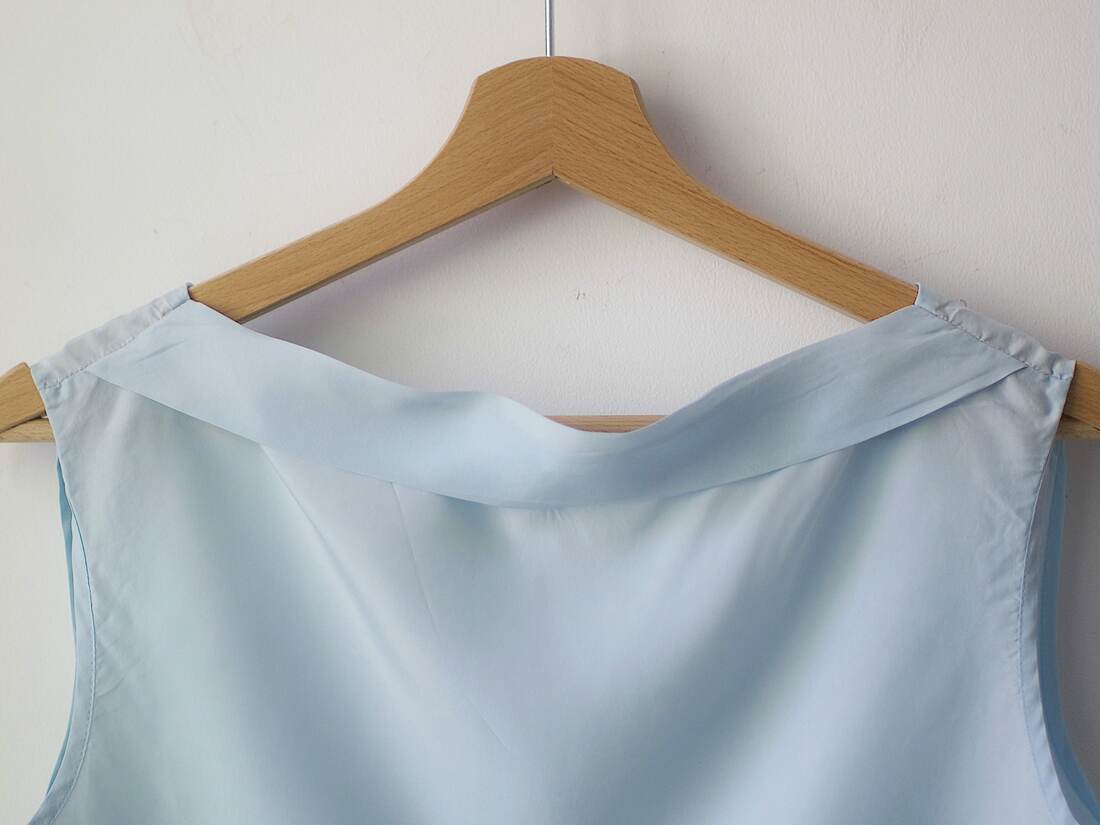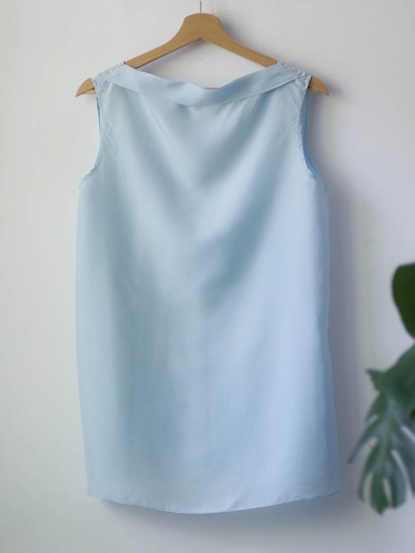 Jedwabna bluzka bez rękawów, z dekoltem V na plecach. Błękitny pastelowy kolor, bez podszewki. Rozmiar z metki S, będzie pasować także na M, bardzo dobry stan.