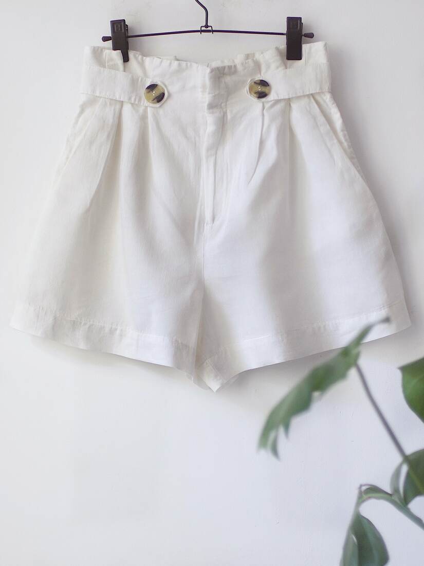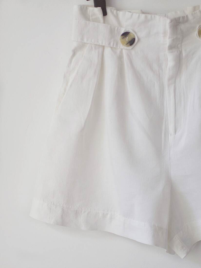 Letnie spodenki z wysokim stanem. Zapinane na ukryty zamek z przodu, dwie kieszenie. Ze względu na gumkę w pasie polecam na S-M. Idealny stan.