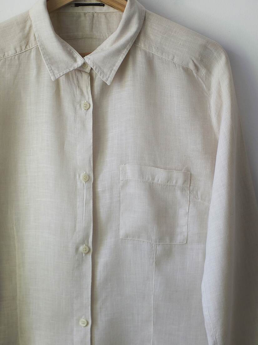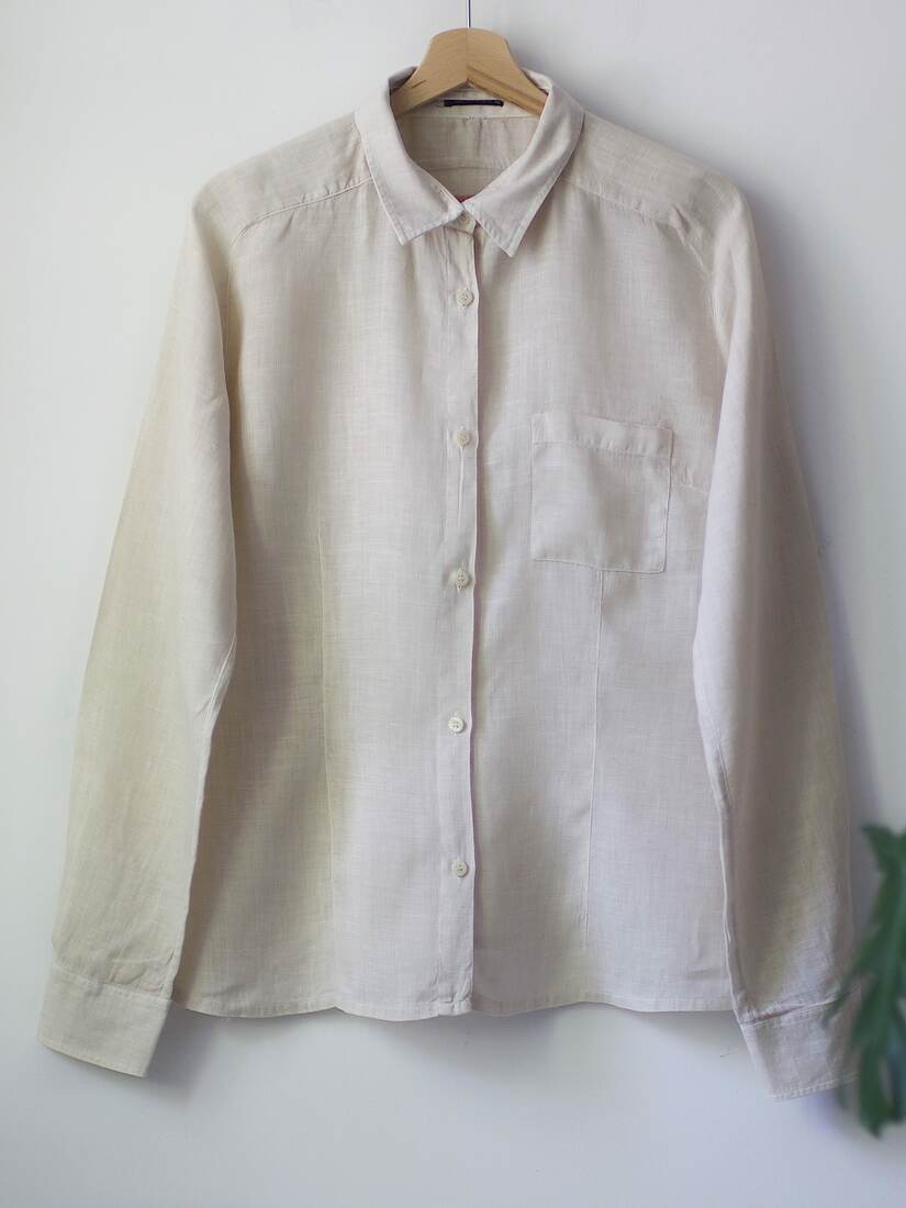 Minimalistyczna lniana koszula w naturalnym kolorze. Wycięta część metek, ma nie zaznaczoną linie ramion, więc będzie dobra na XS-S-M, zależnie od pożądanego dopasowania. Bez wad.