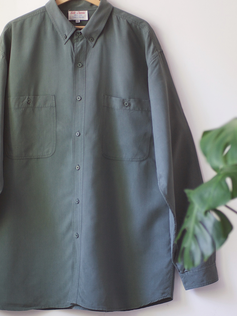 Koszula o obszernym kroju w 100% wykonana z wysokogatunkowego chińskiego jedwabiu. Materiał jest grubszy i nie prześwituje, więc może być noszona jako sukienka, lub lekka narzuta. Bardzo dobry stan.