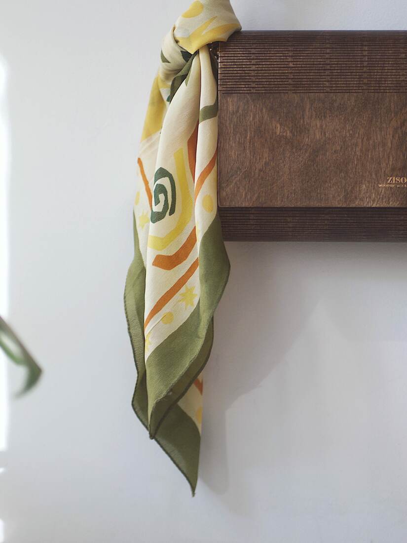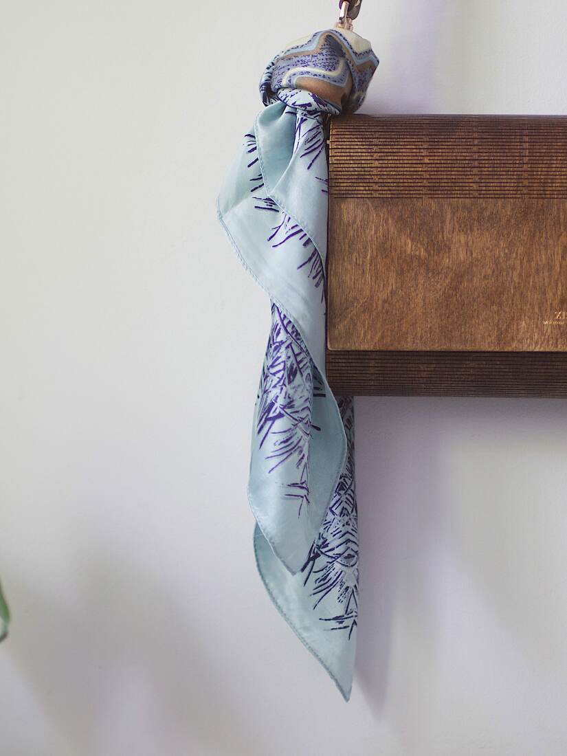Jedwabna apaszka w abstrakcyjny wzór. Nowa bez metek, ma mała wadę farbowania, pokazaną na zdjęciach, nie widoczną w noszeniu. Wymiary: 52*52 cm.