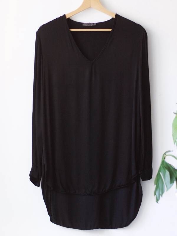 70,00 złBluzka z asymetrycznym dołem i dekoltem v. Wykonana z satynowego, gładkiego materiału z dodatkiem jedwabiu. Rozmiar z metki S, jest dość luźna, więc będzie dobra także na M. Bez wad.