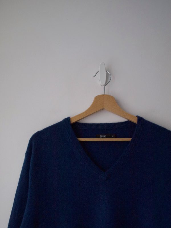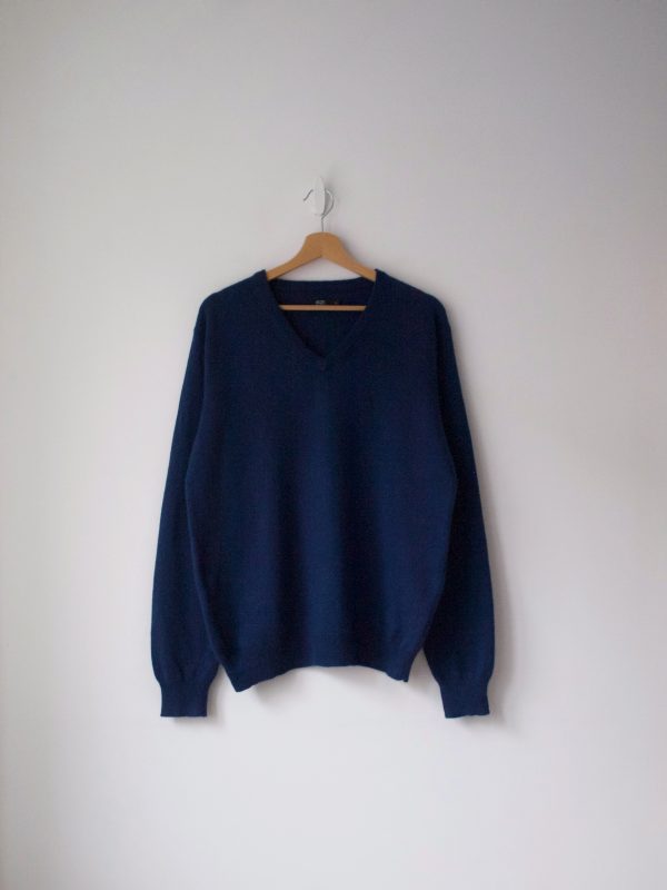 Granatowy sweter z dekoltem w serek. W 100% wykonany z kaszmiru, bardzo miły w dotyku.