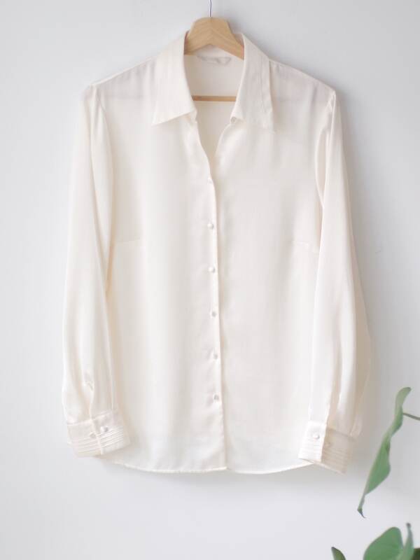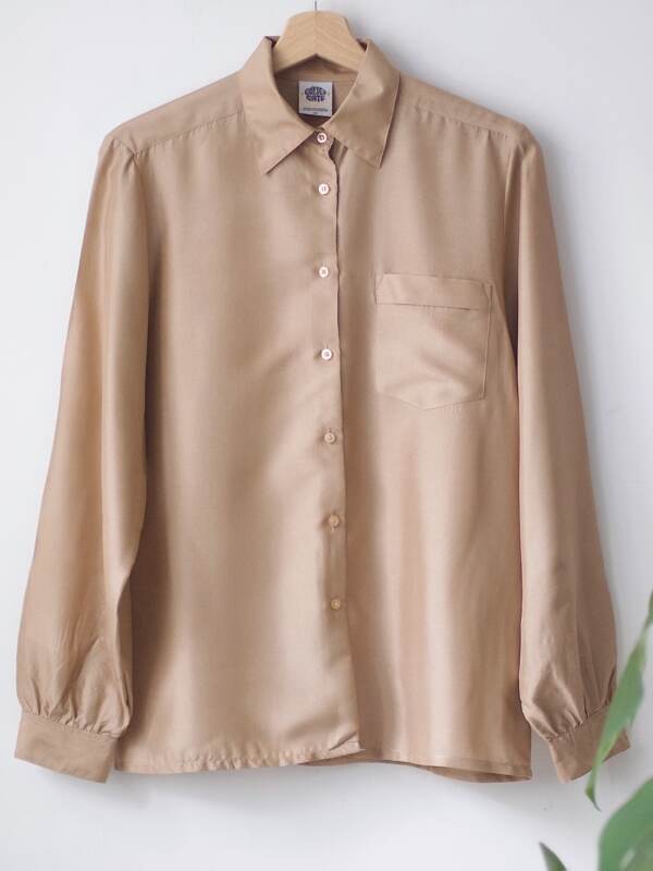 110,00 złBeżowa jedwabna koszula vintage. Grubszy, porządny materiał o złocistym połysku. Koszula nie była noszona (posiadała metki papierowe, zostały odcięte przed czyszczeniem). W jednym miejscu ma małe pogrubienie materiału (ostatnie zdjęcie), nie jest to skaza, tylko specyfika materiału. Rozmiar z metki 40, wymiary poniżej.