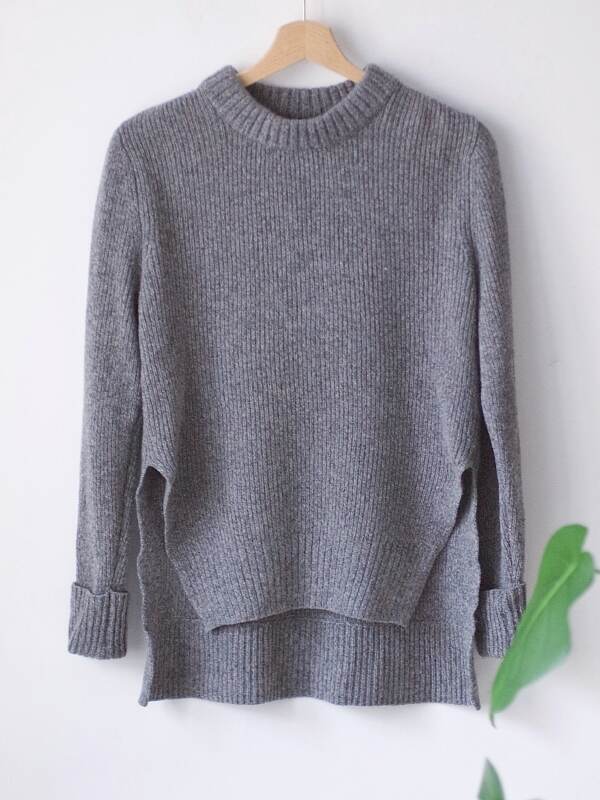 Minimalistyczny półgolf skandynawskiej marki Haust. Dół i rękawy wykończone dłuższym ściągaczem. Metka ze składem wycięta, ale jest to wełna merynosa. Będzie dobry na XS-S, wymiary poniżej. Bez wad.