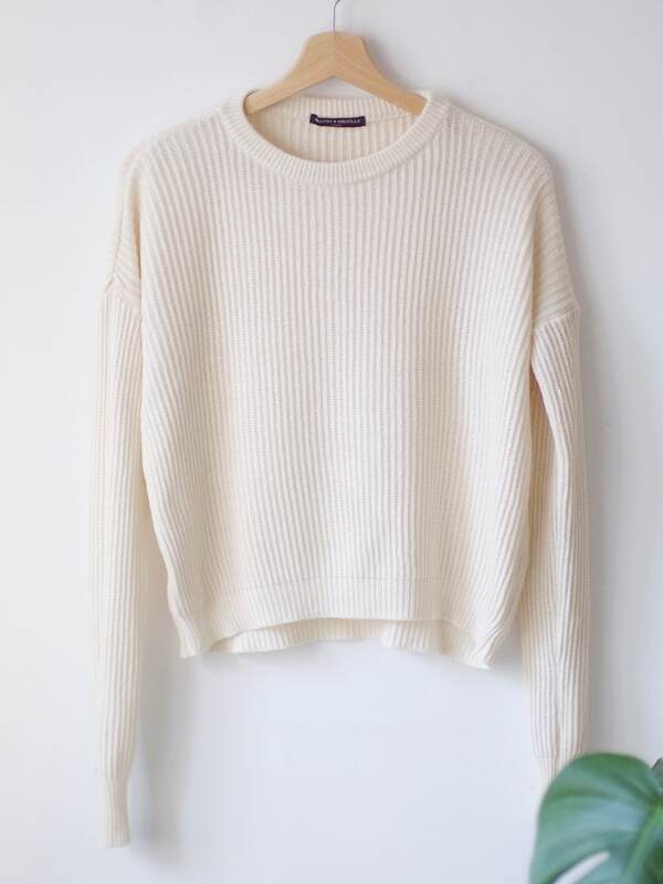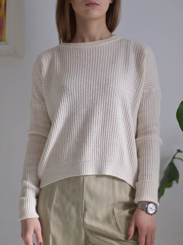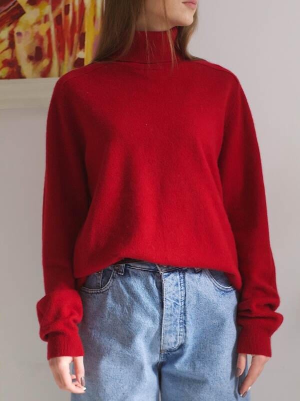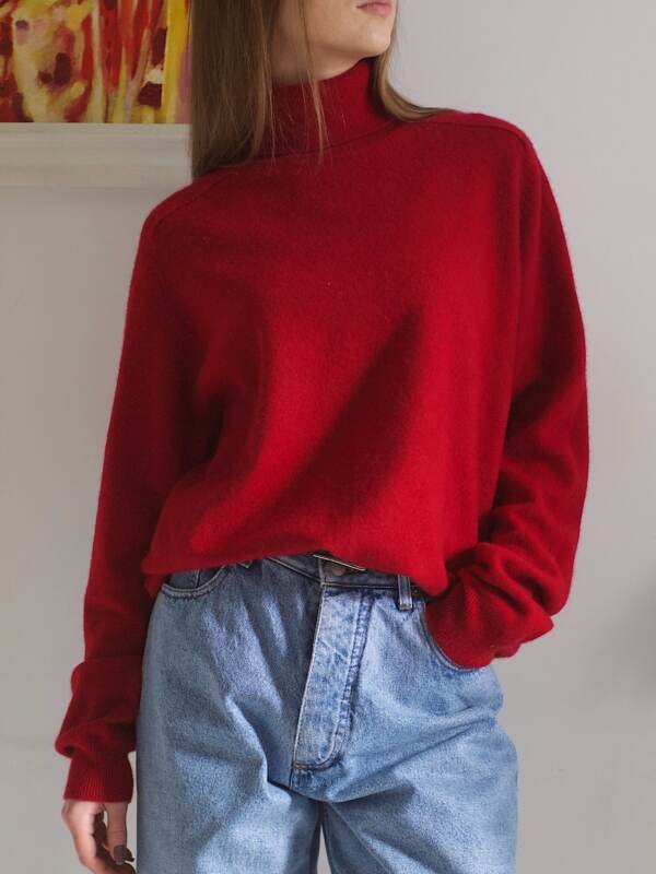 Sweter vintage o pudełkowym kroju. Wyprodukowany we Włoszech, miękki i nie gryzący materiał, 70% wełna. Obniżone ramiona, delikatnie dłuższy tył. Rozmiar z metki „one size”, modelka ma 165 cm wzrostu i nosi rozmiar xs-s. Bez wad.