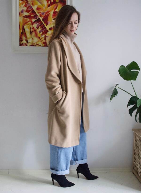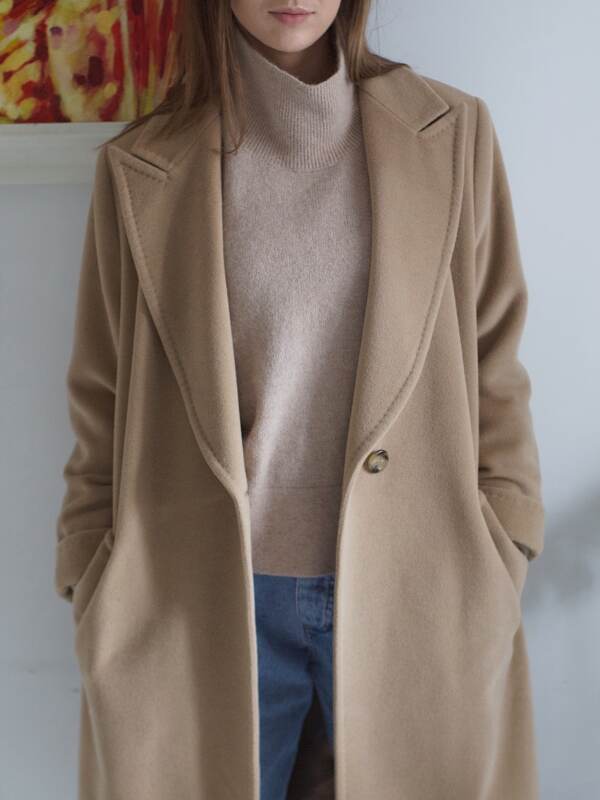 Piękny, klasyczny płaszcz włoskiej marki Max Mara. Bardzo dobrze skrojony, wykonany z wysokogatunkowego materiału 50% wełna, 50% angora. Luźny krój, rękawy można podwijać. Rozmiar z metki L, modelka ma 165 cm wzrostu i nosi rozmiar XS/S, wymiary poniżej.