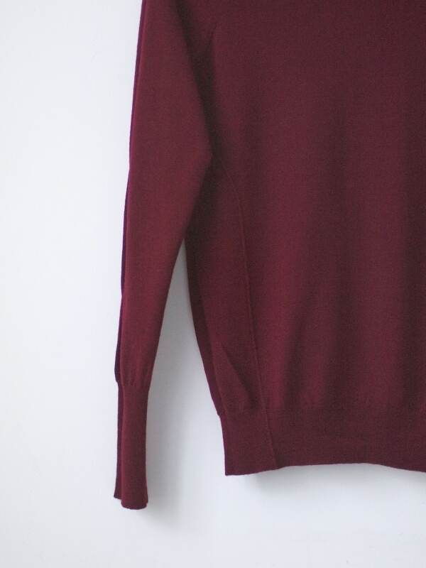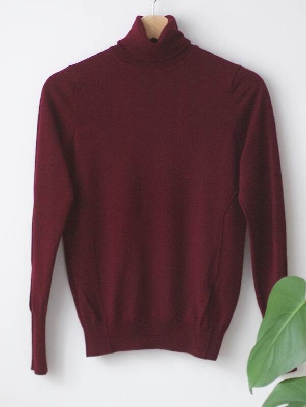 Wełniany golf angielskiej marki Jaeger w kolorze głębokiego bordo. W jednym miejscu ma małe, nie widoczne w noszeniu zszycie (ostatnie zdjęcie), poza tym idealny stan. Rozmiar z metki S, wymiary poniżej.