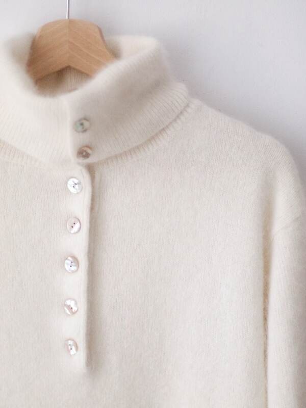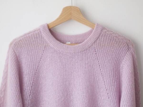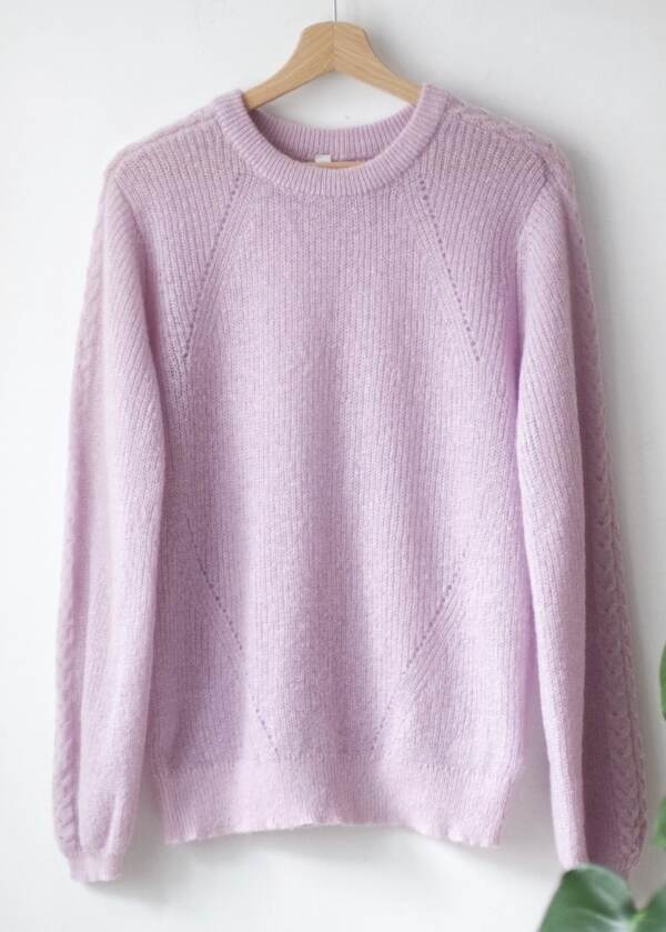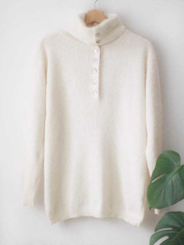 Sweter o luźnym kroju, wykonany z ciepłej mieszanki wełny oraz moheru (34% moher, 34% wełna, 27% poliester, 5% elastan). Rozmiar z metki M, wymiary poniżej. Bez wad.