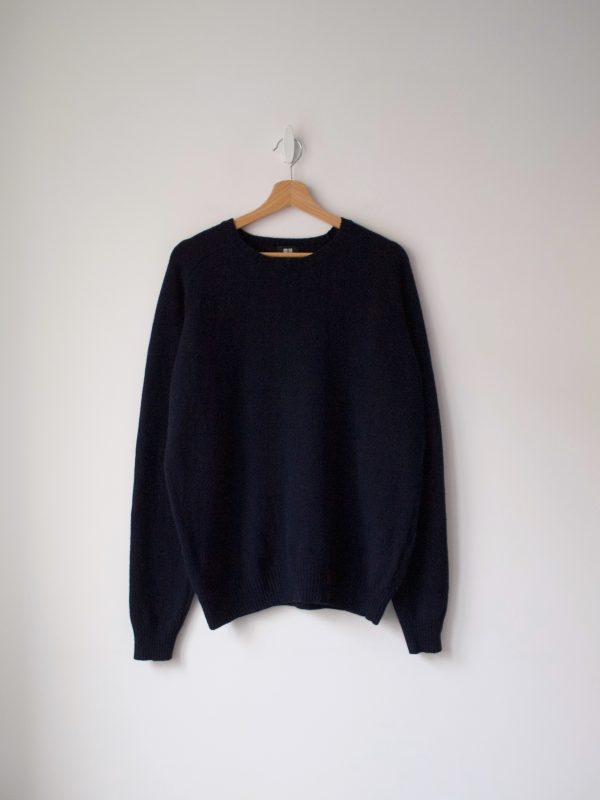 Granatowy sweter marki Uniqlo, w 100% wykonany z wełny.