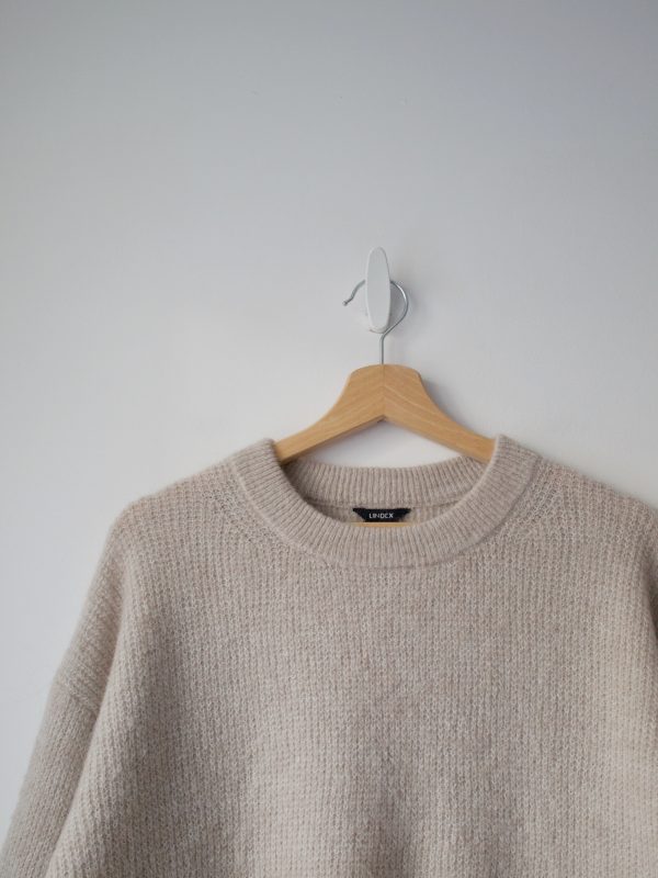 Puszysty beżowy sweter. Luźny fason, poszerzane rękawy