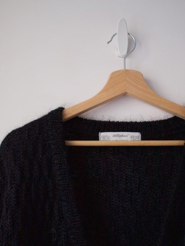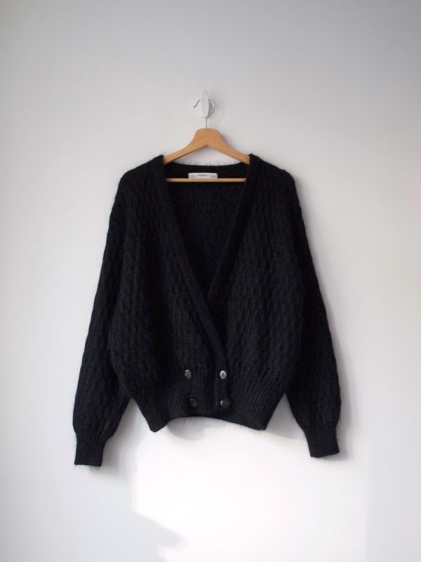 Bardzo puszysty kardigan vintage, wykonany z tkaniny z dużym dodatkiem moheru.